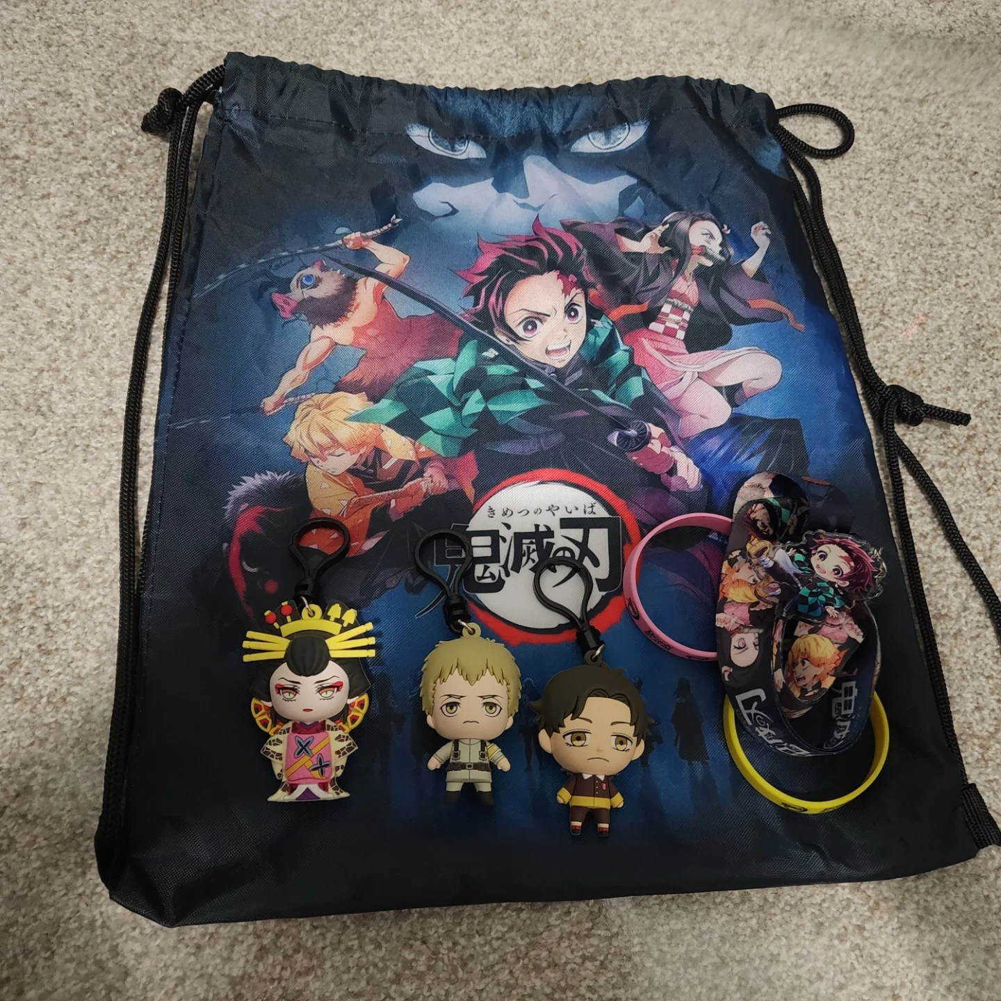 Selling a Demon Slayer drawstring bag filled with anime stickers and keychains! It's perfect for any fan of the series. The bag is in great condition and ready for a new owner! Lots of stickers really great haul here.