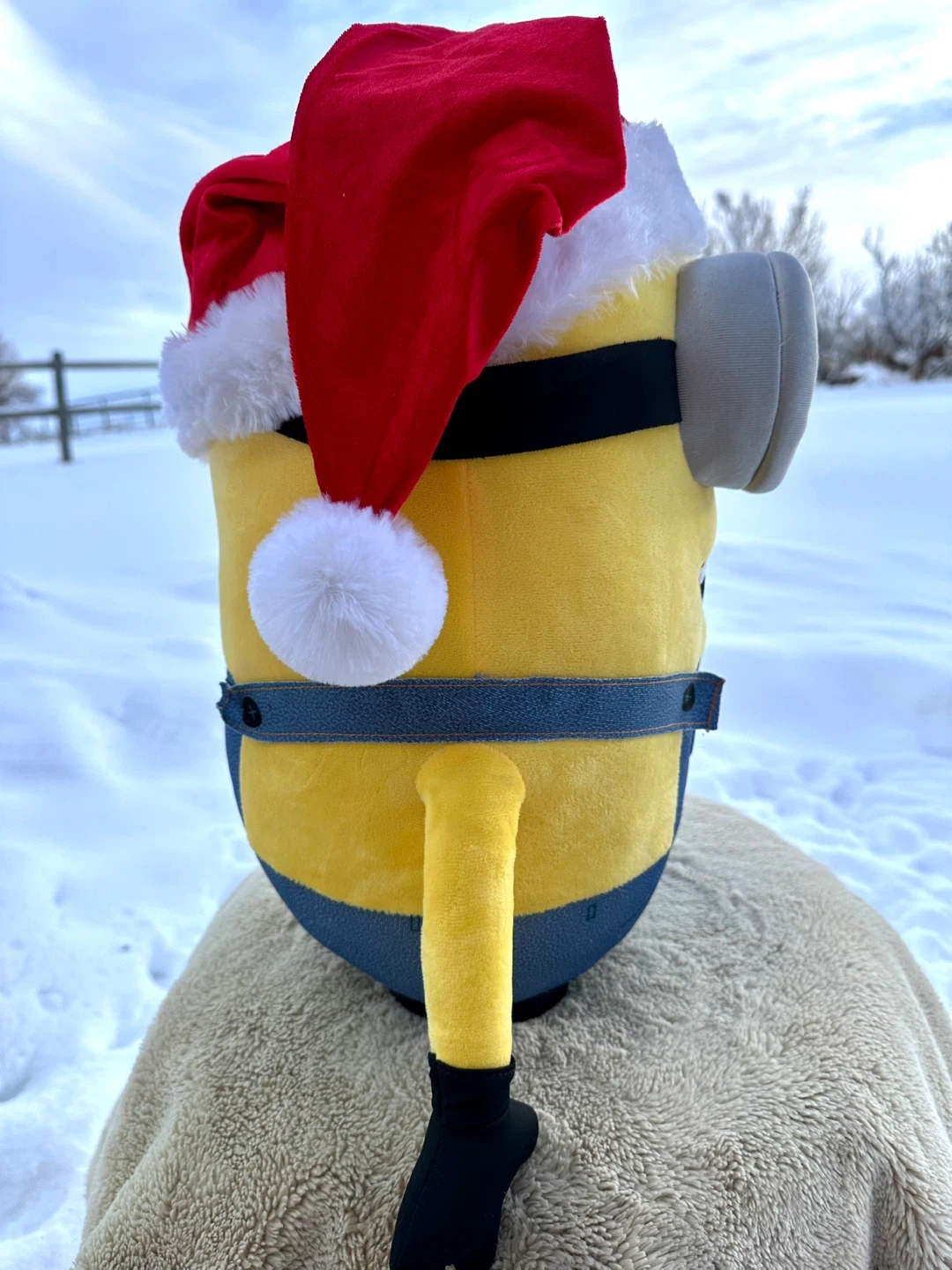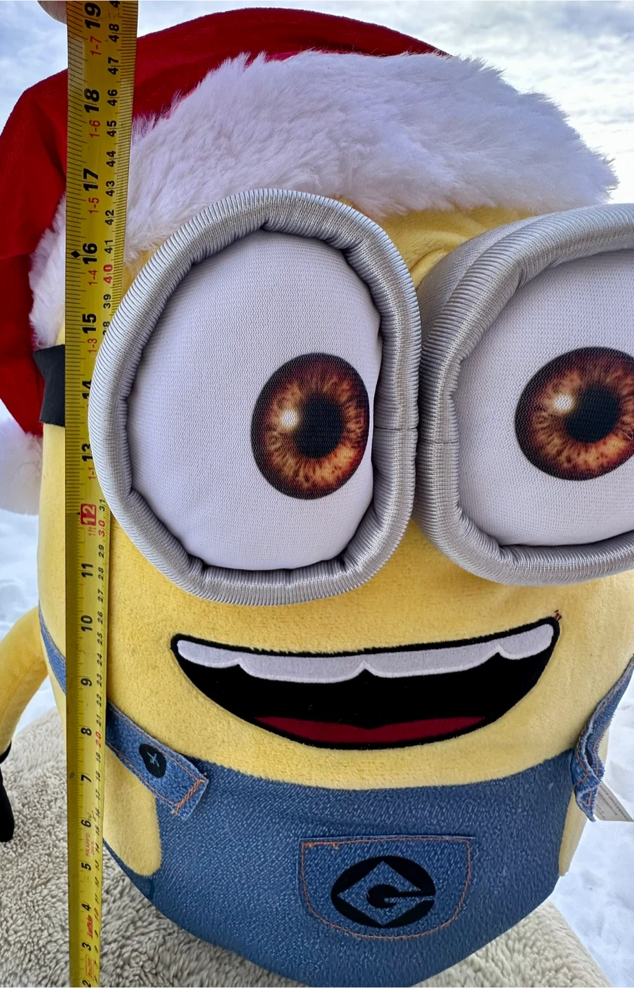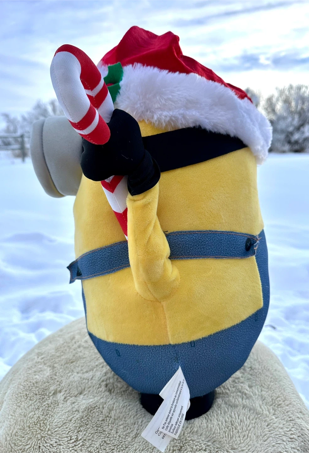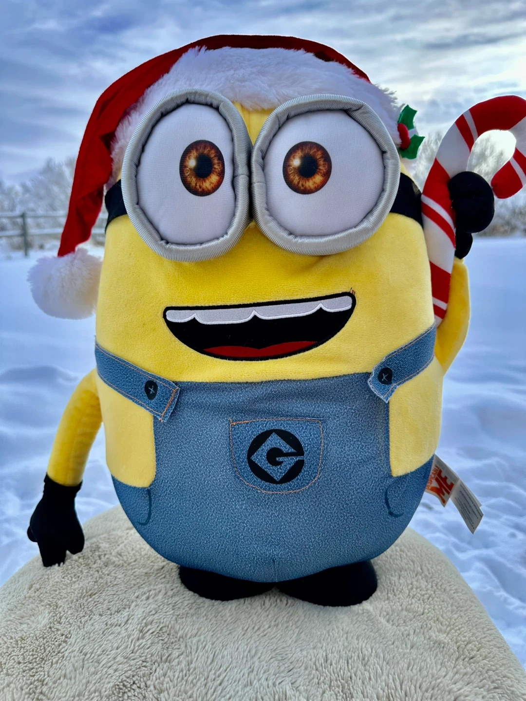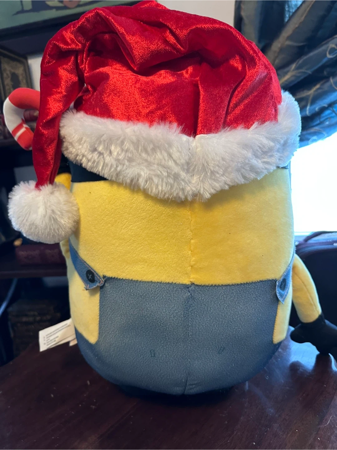 Universal adorable Despicable Me Minion plush! It's dressed up for the holidays with a cute Santa hat and candy cane.