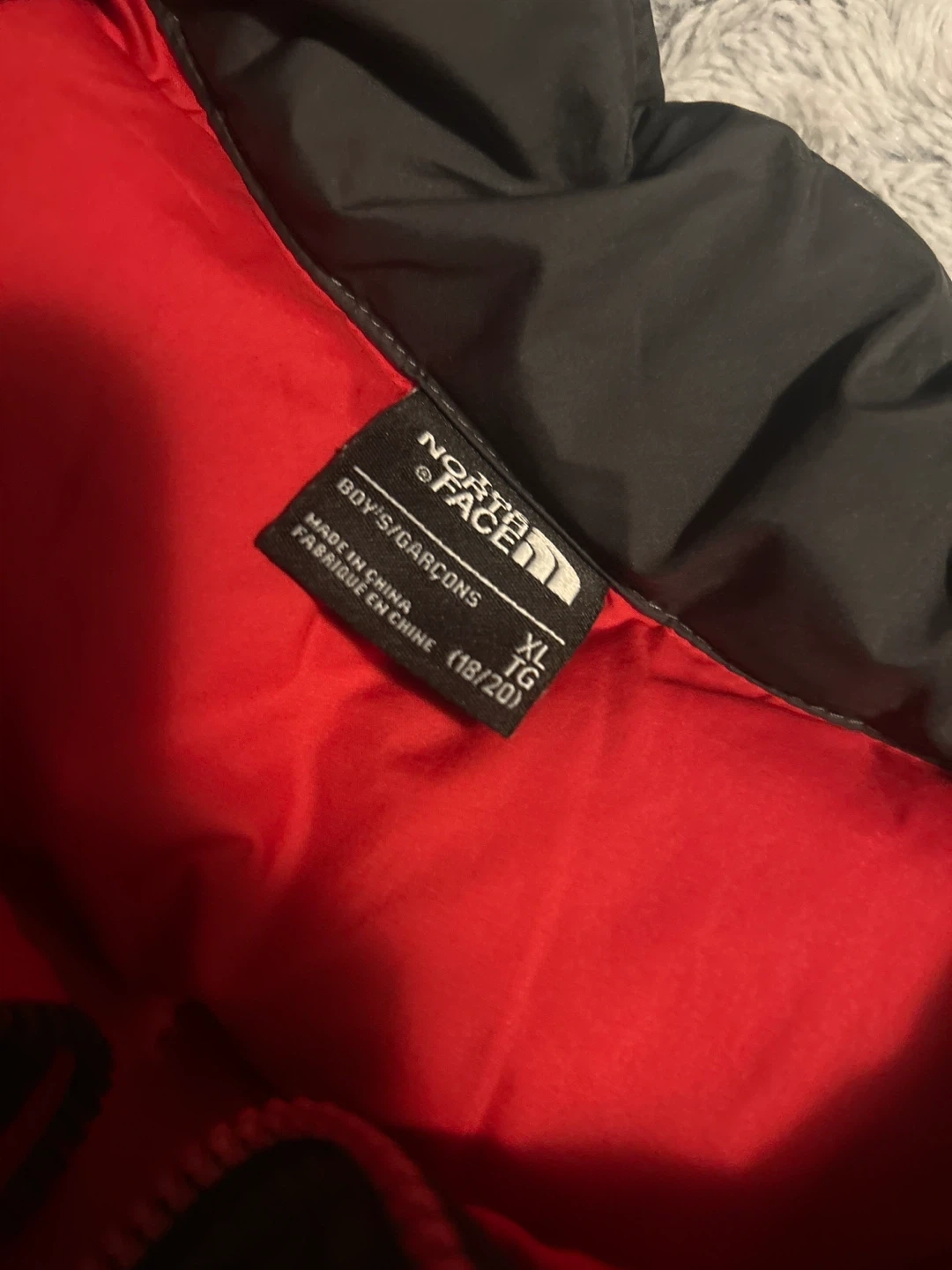 I'm selling a The North Face boy's puffer jacket in size XL (18/20). It's in great condition and ready for the cold weather! The jacket is black with a red interior and red accents.