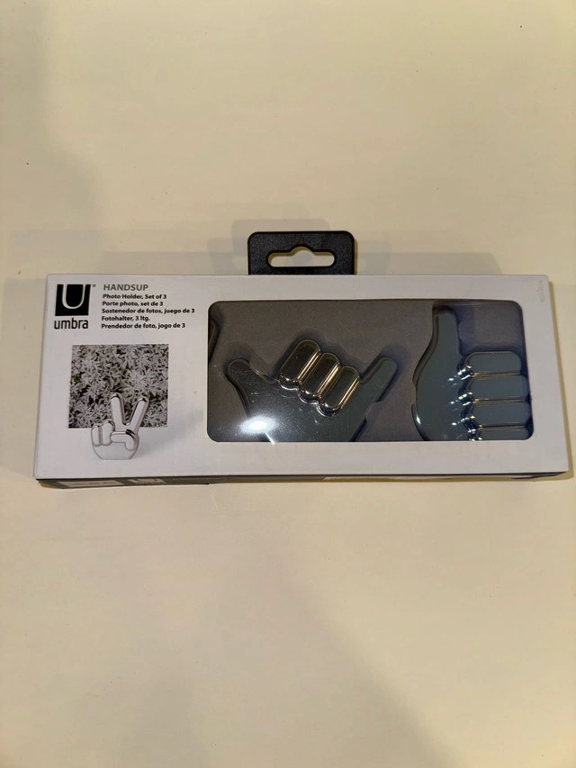 Brand new Umbra Hands Up photo holder set of 3 for sale. Fun and stylish design featuring mini hand-shaped holders that securely display photos, notes, or cards. Perfect for adding a playful touch to your desk, shelf, or home décor. Still in original packaging and never used.