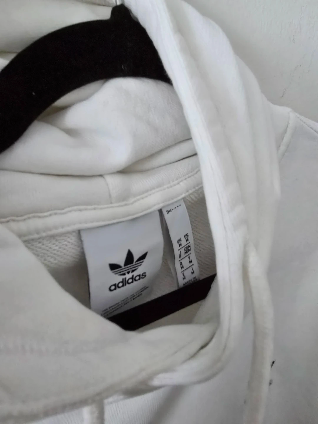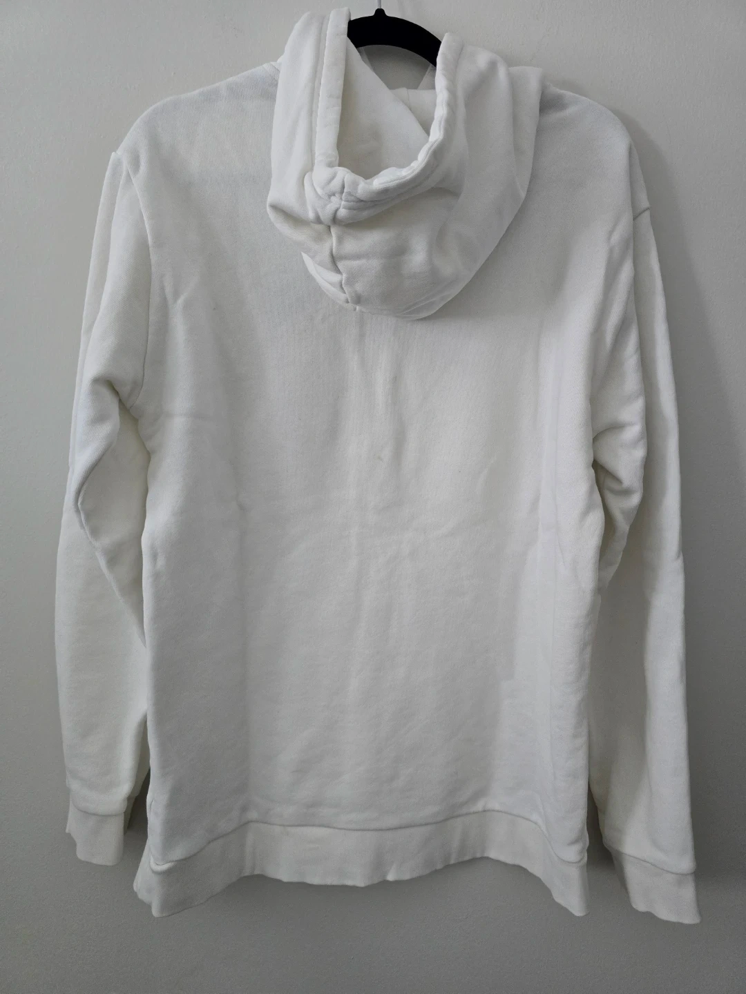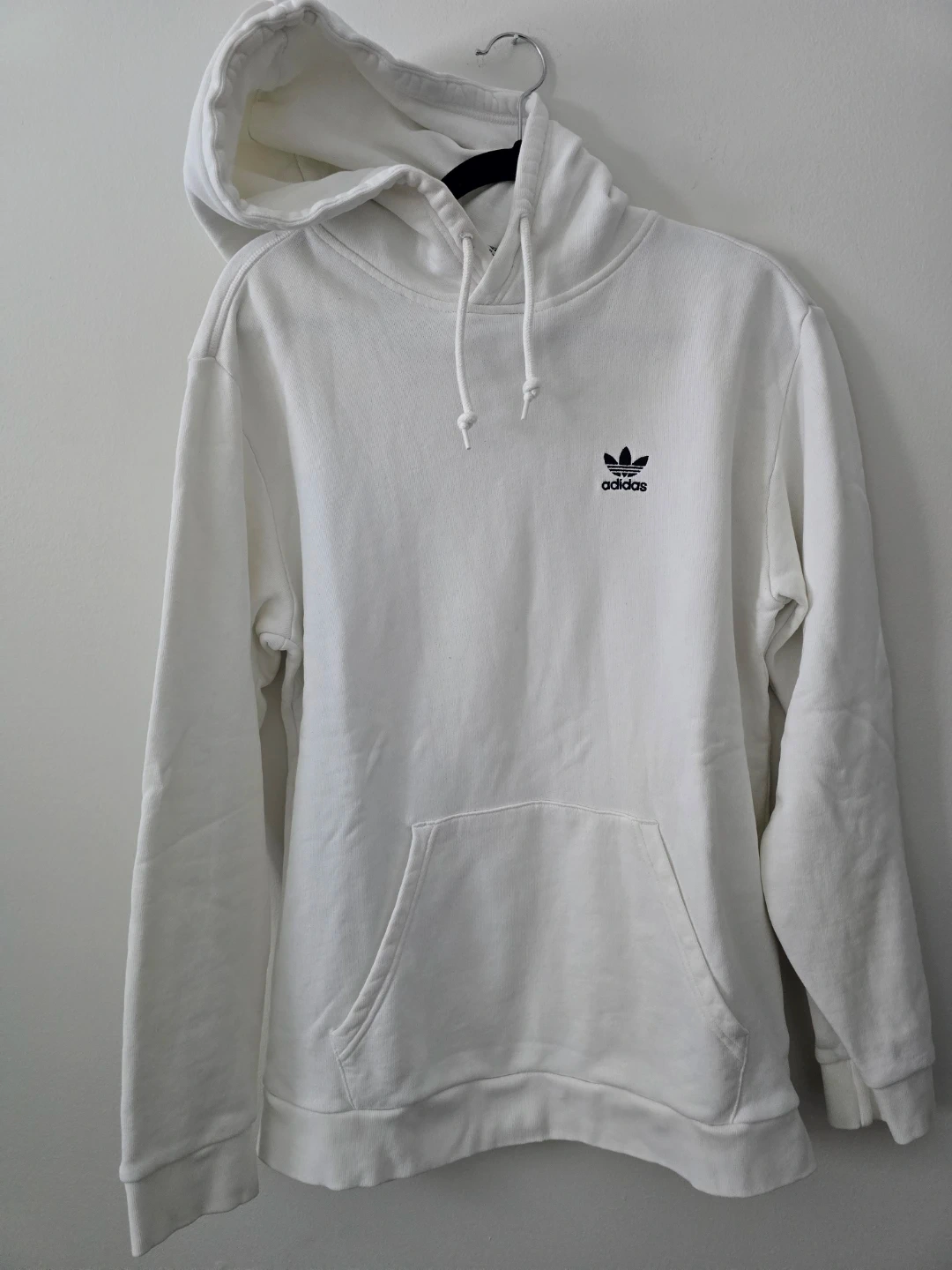 Selling an Adidas hoodie in white, size medium. It's in great condition and super comfy! The classic Adidas logo is embroidered on the chest. Perfect for layering or just lounging around
