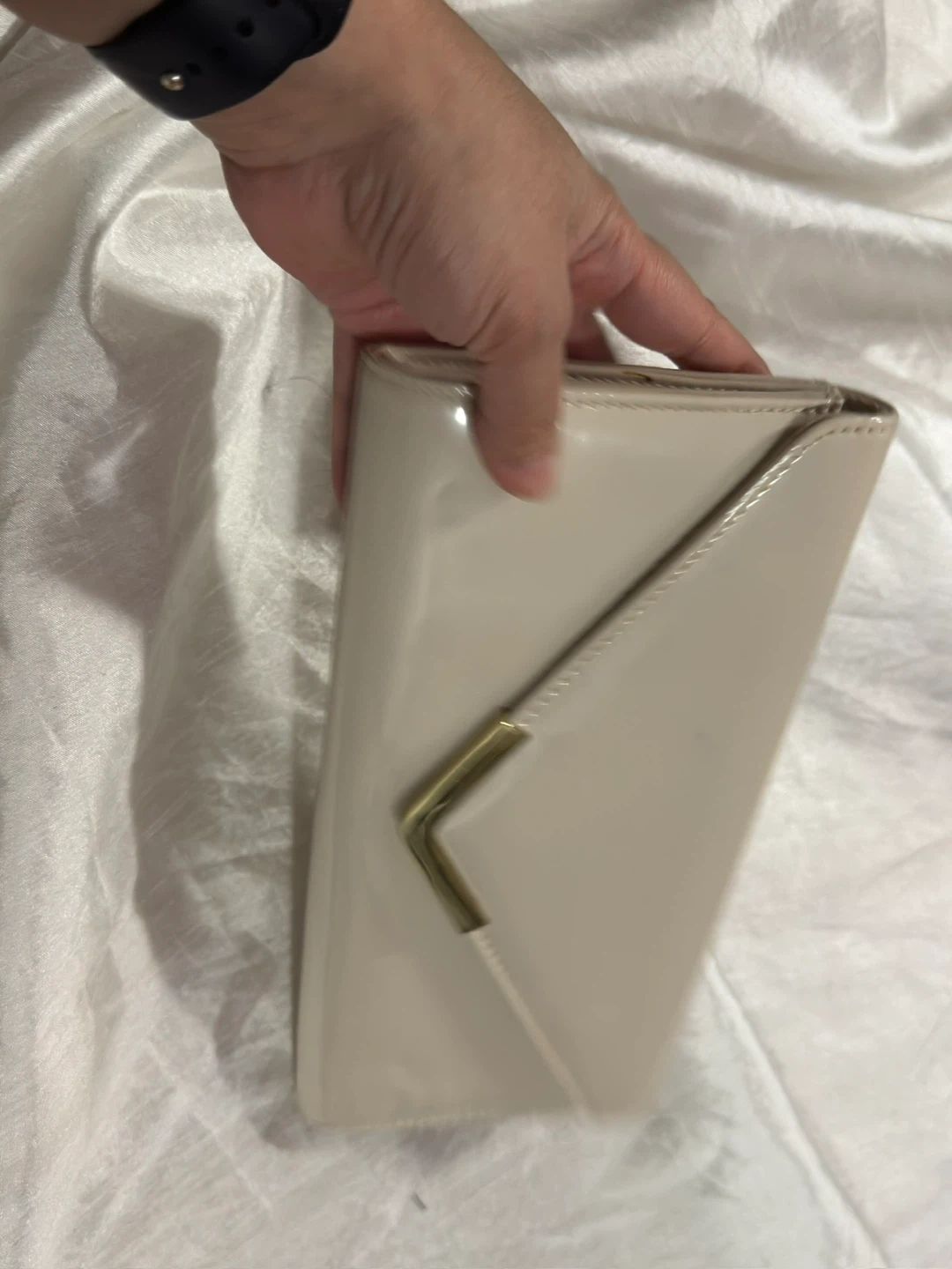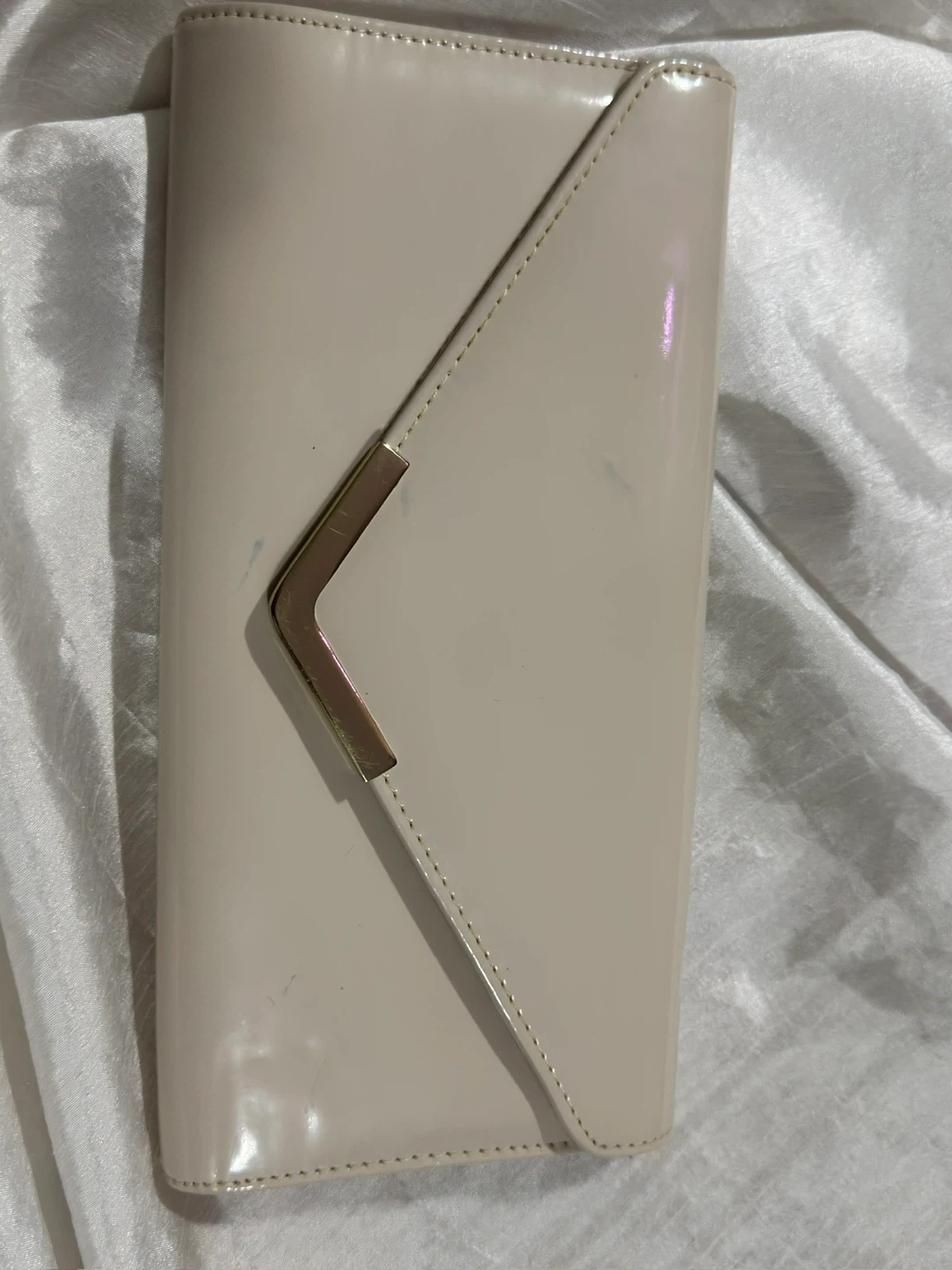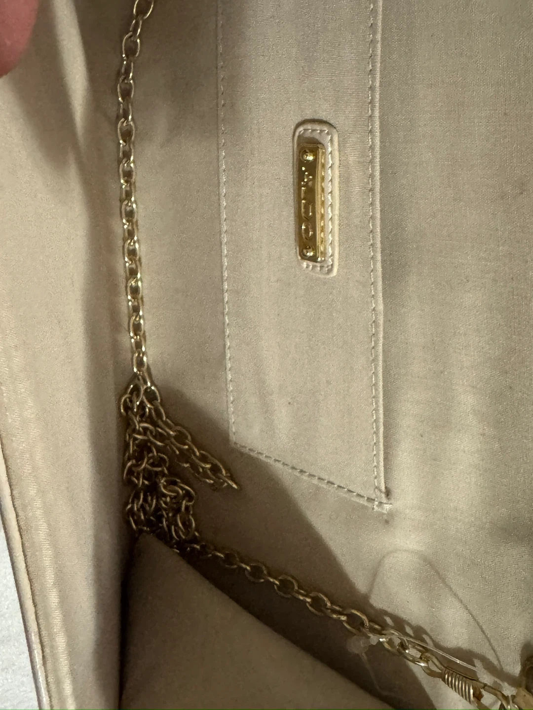 Selling a cute Aldo clutch purse in a beige colour! It has a gold-tone accent on the front and a chain strap inside. Perfect for evenings out or special occasions