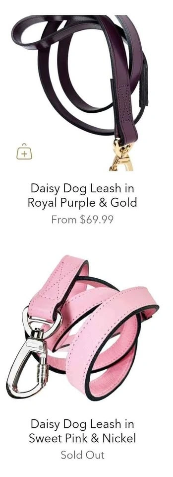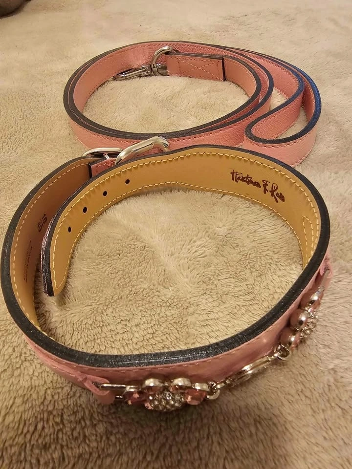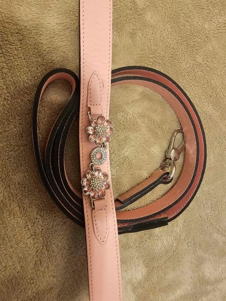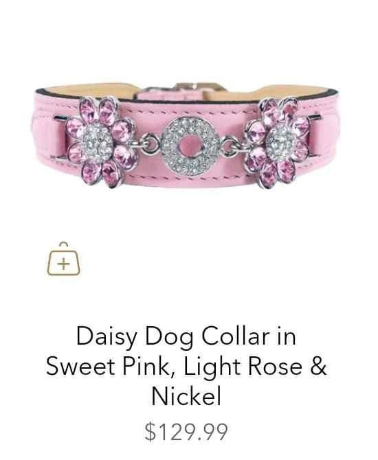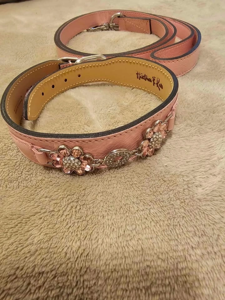 Daisy leather Dog Collar - size 16 inches - in sweet pink, light rose & nickel. Retails for $129.99. Plus, Matching Daisy leather Dog Lead in sweet pink and nickel. Leash retails for $69.99.