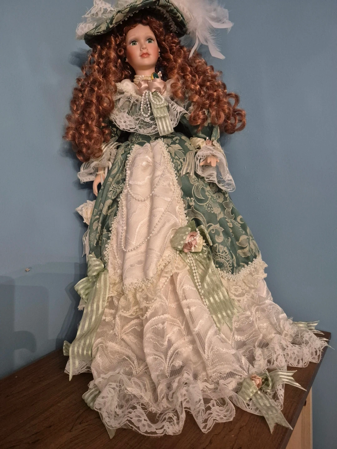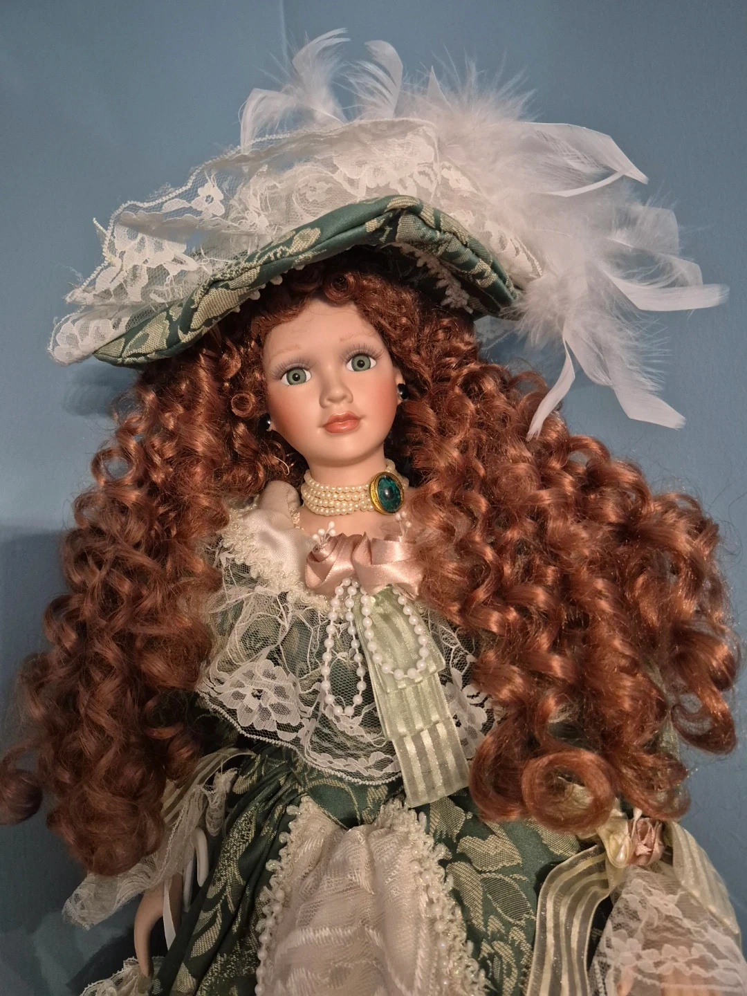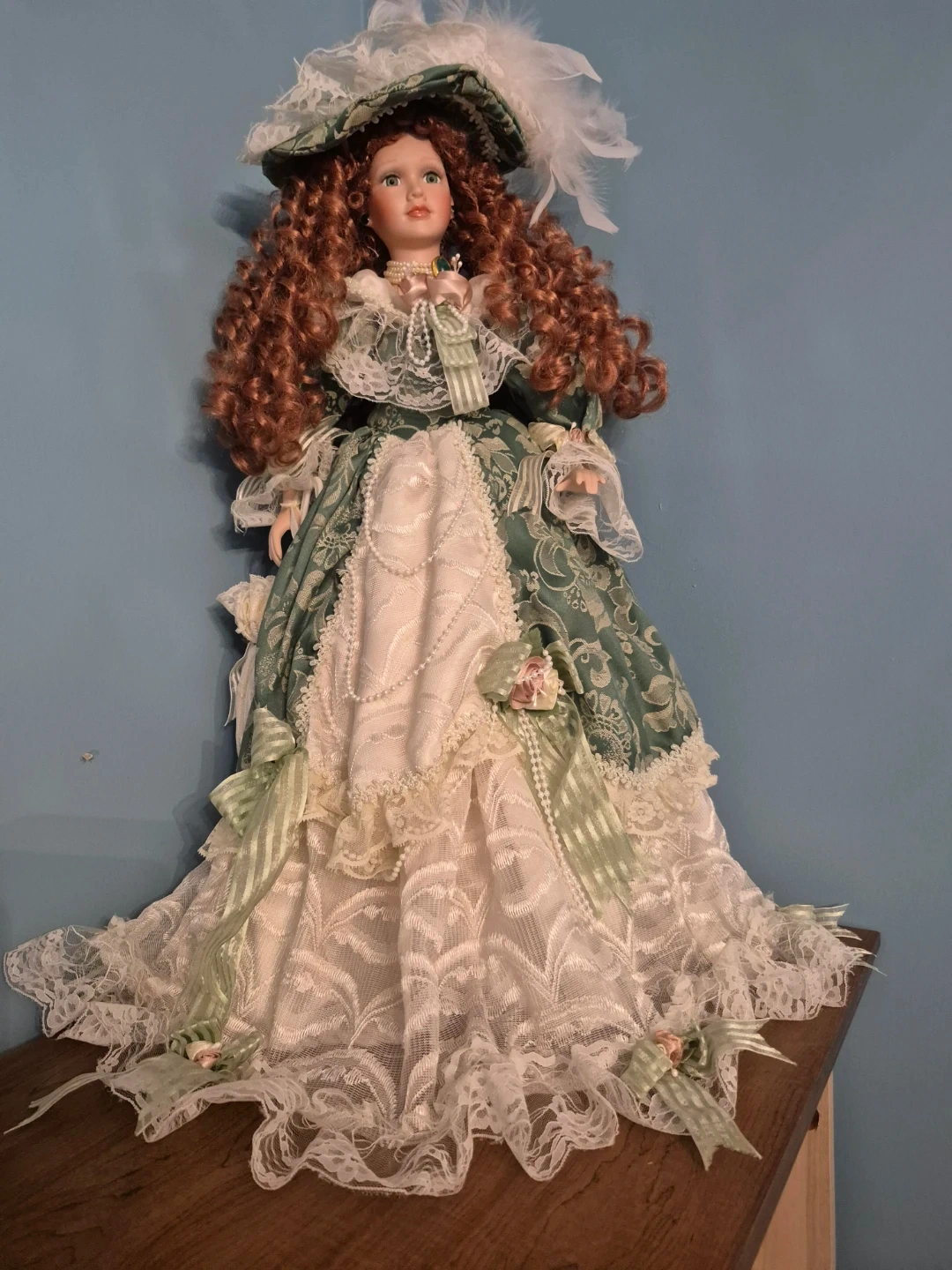Beautiful porcelain doll dressed in a lovely green and white gown with lace detailing and a matching hat. A great addition to any doll collection!