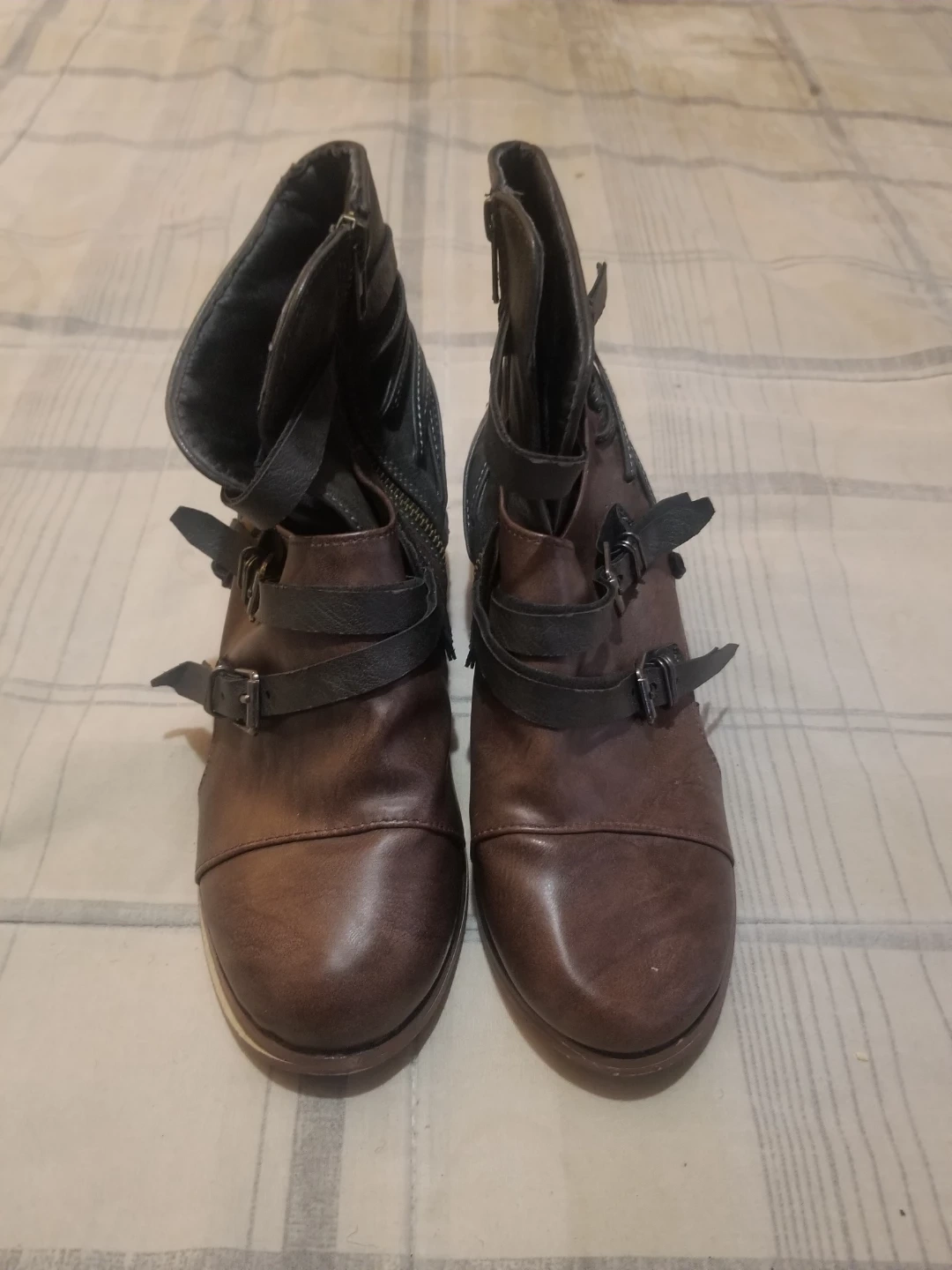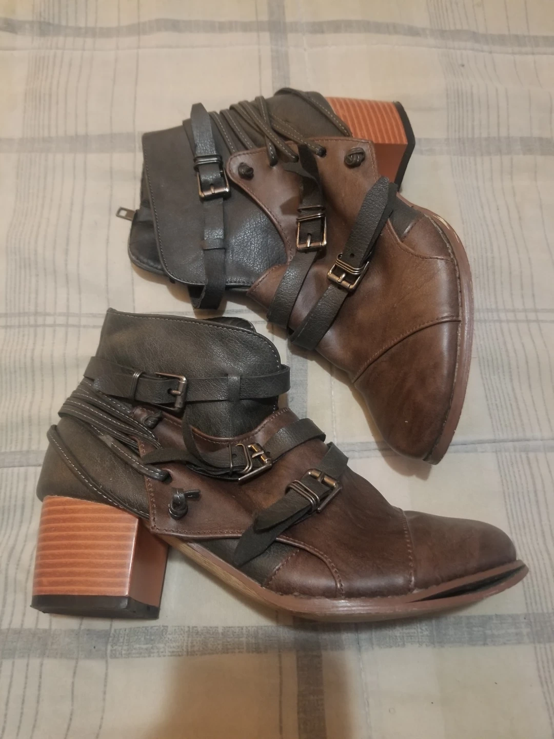 Hey! 🥕Selling a pair of brown leather ankle boots in size 8/8.5. They feature a unique design with buckle straps and a block heel. These boots are in good condition and ready for a new owner! Asking Only $10 If Interested Please let me Know and can Pickup at 230 Woolner Ave York,ON Thxs