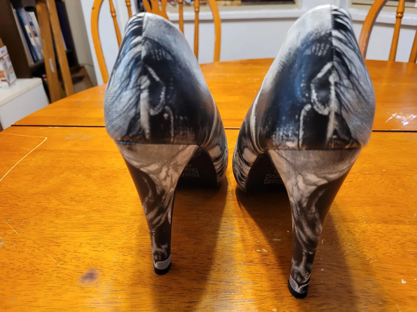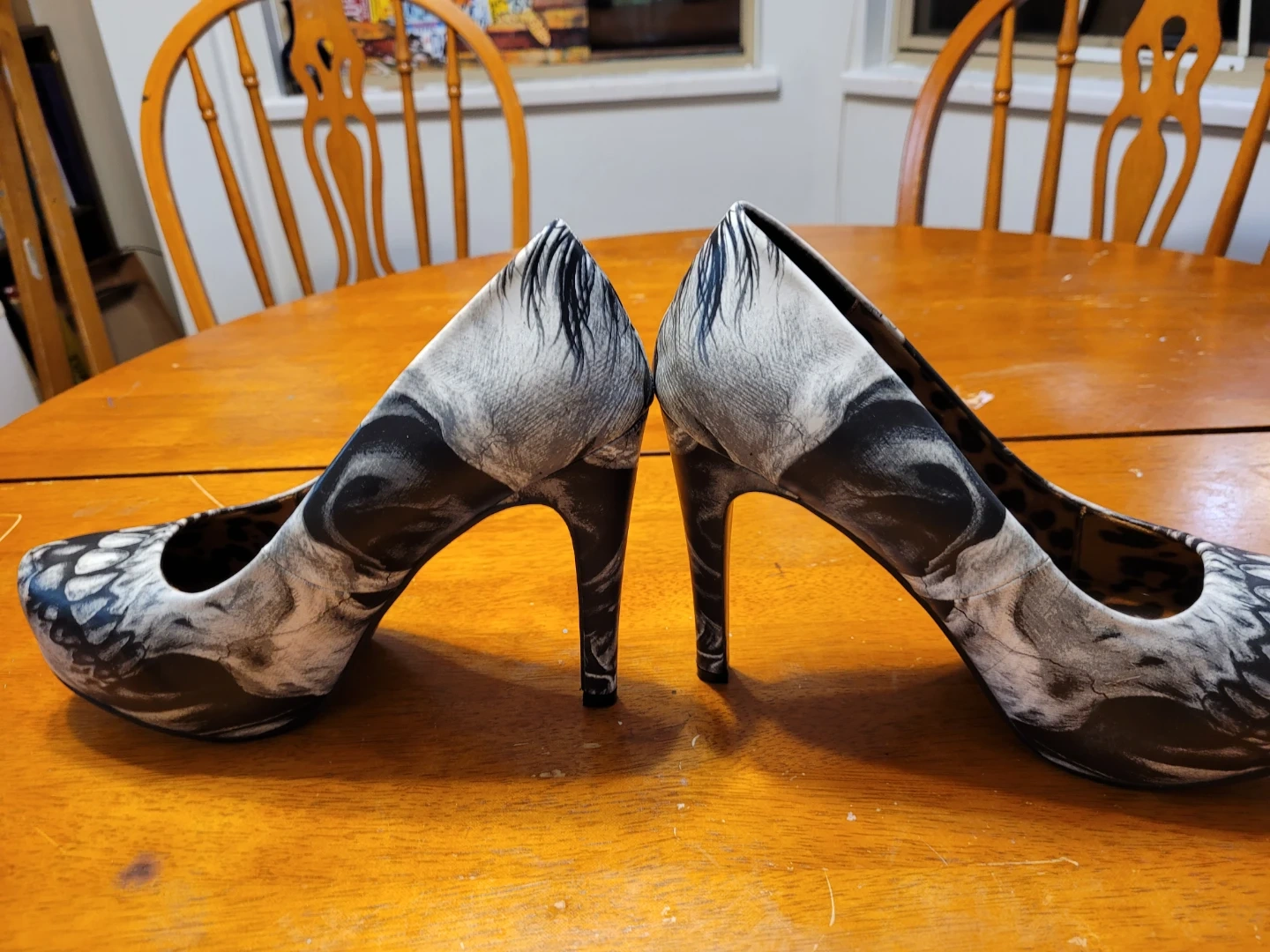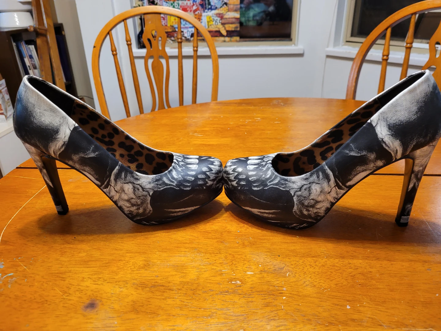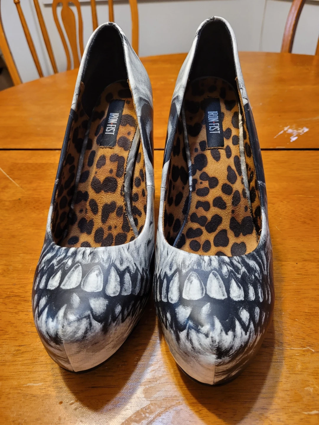 Selling a pair of Iron Fist Bone Eater heels. They feature a striking black and white skull design on the exterior and a fun leopard print lining. These heels are sure to make a statement!