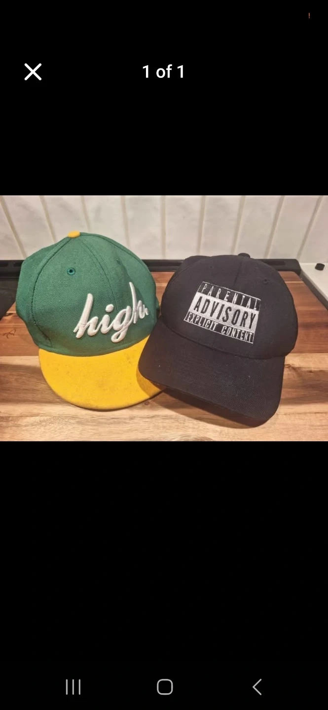 Selling two baseball caps. One is green and yellow with the word "high" embroidered on it, and the other is black with a "Parental Advisory" logo.