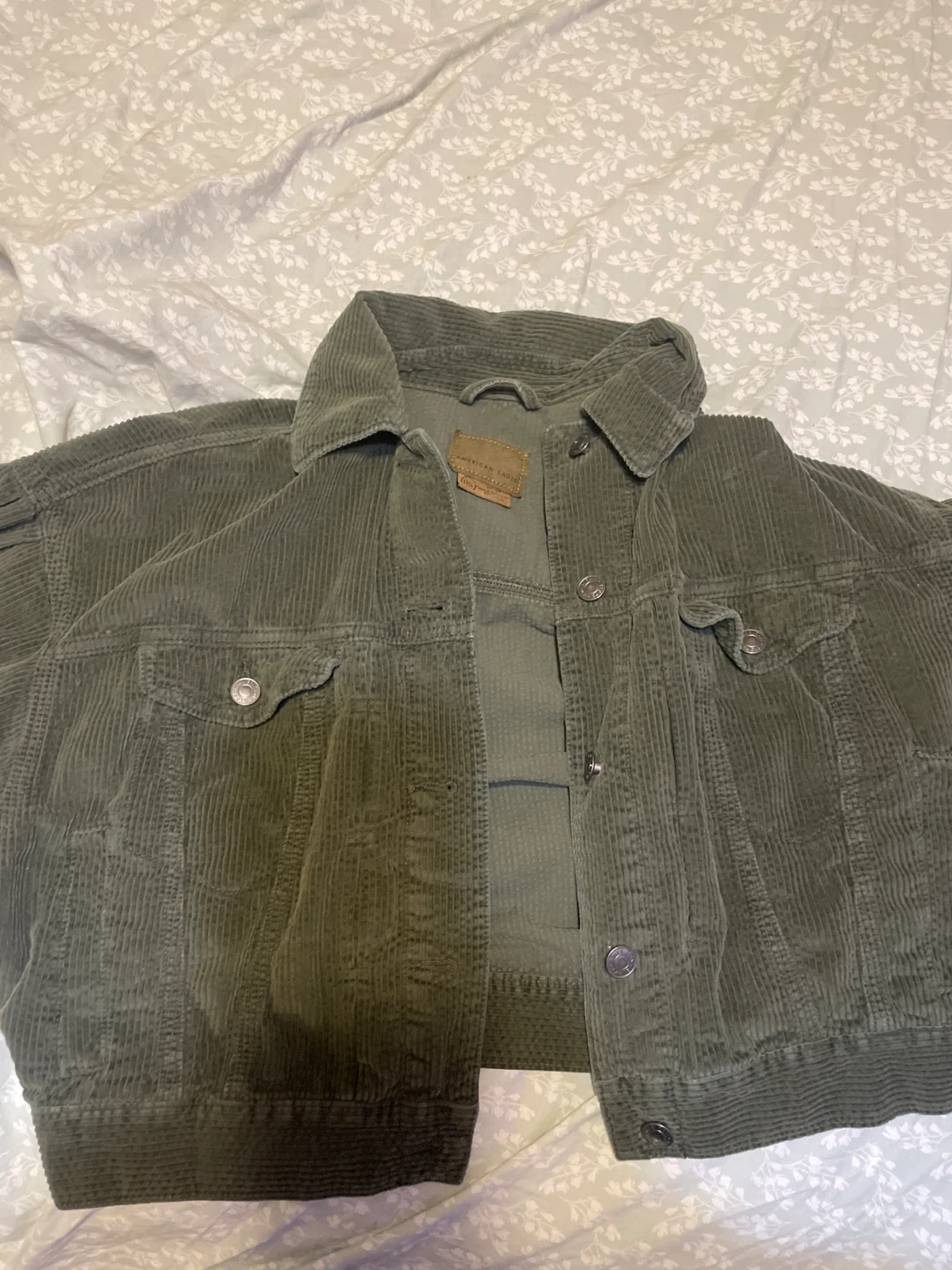 Selling an American Eagle corduroy jacket in olive green. It's a classic piece that's perfect for layering. The jacket features a button-up front and chest pockets. It's in great condition and ready for a new home!