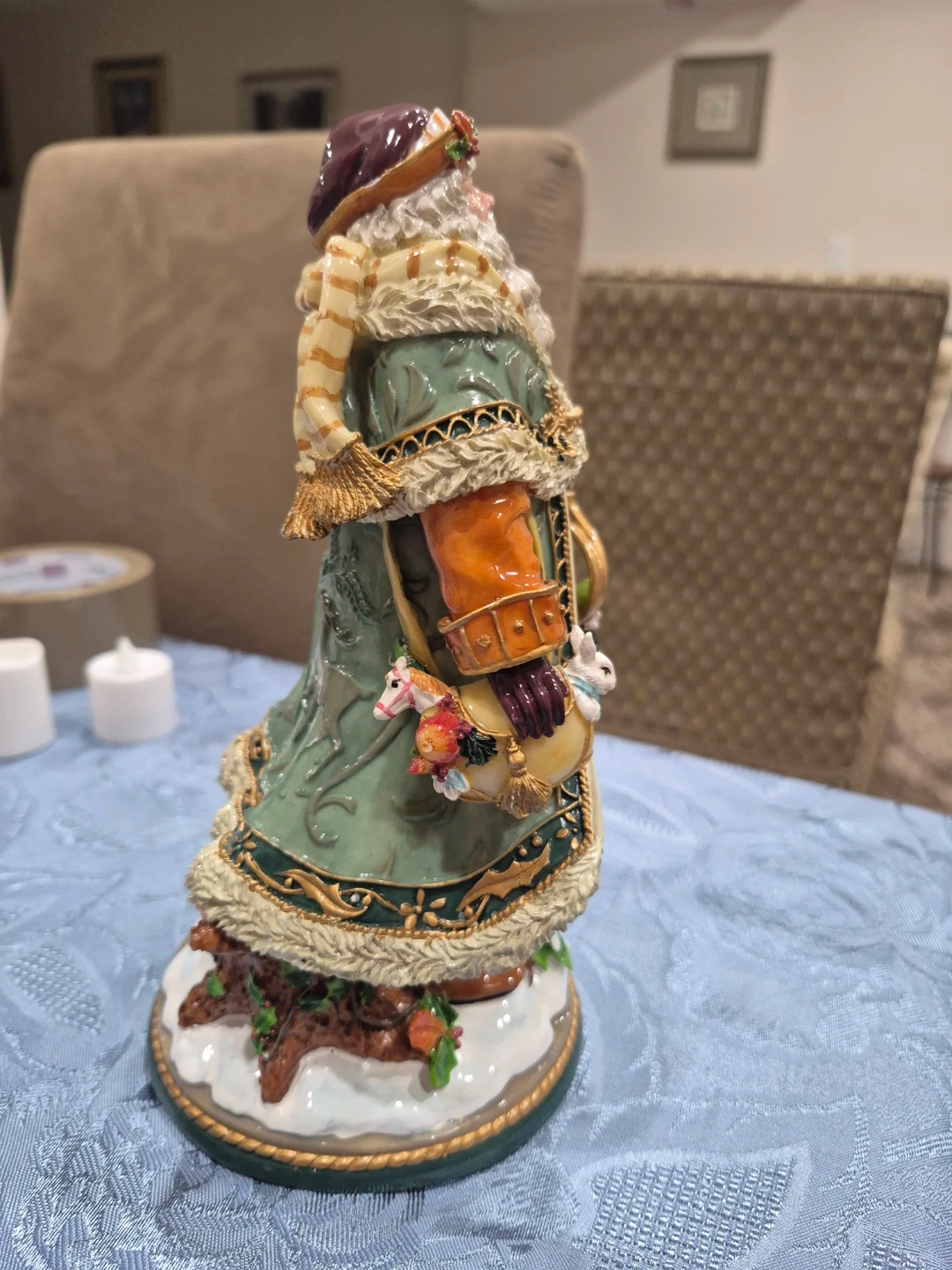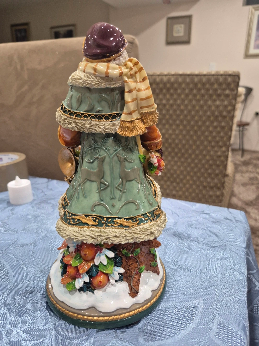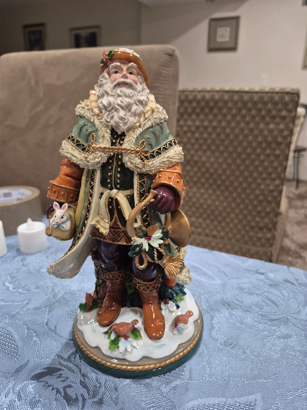 A festive Santa Claus figurine in excellent condition. It features a detailed design with a green coat, brown boots, and a decorative base with snow and foliage. Perfect for adding a touch of holiday cheer to your home!