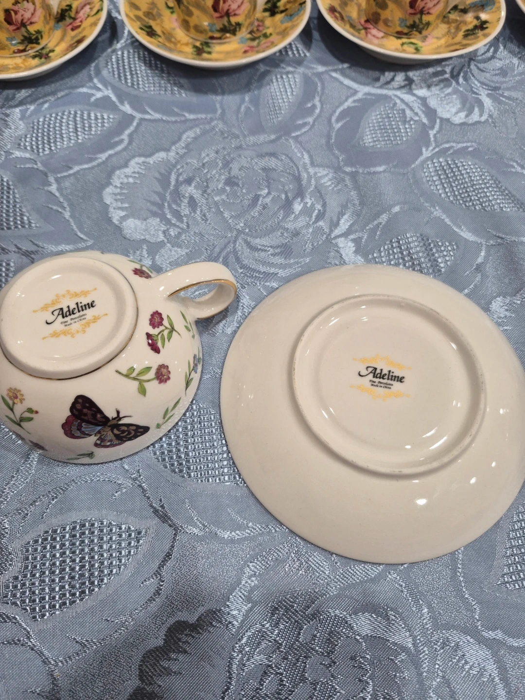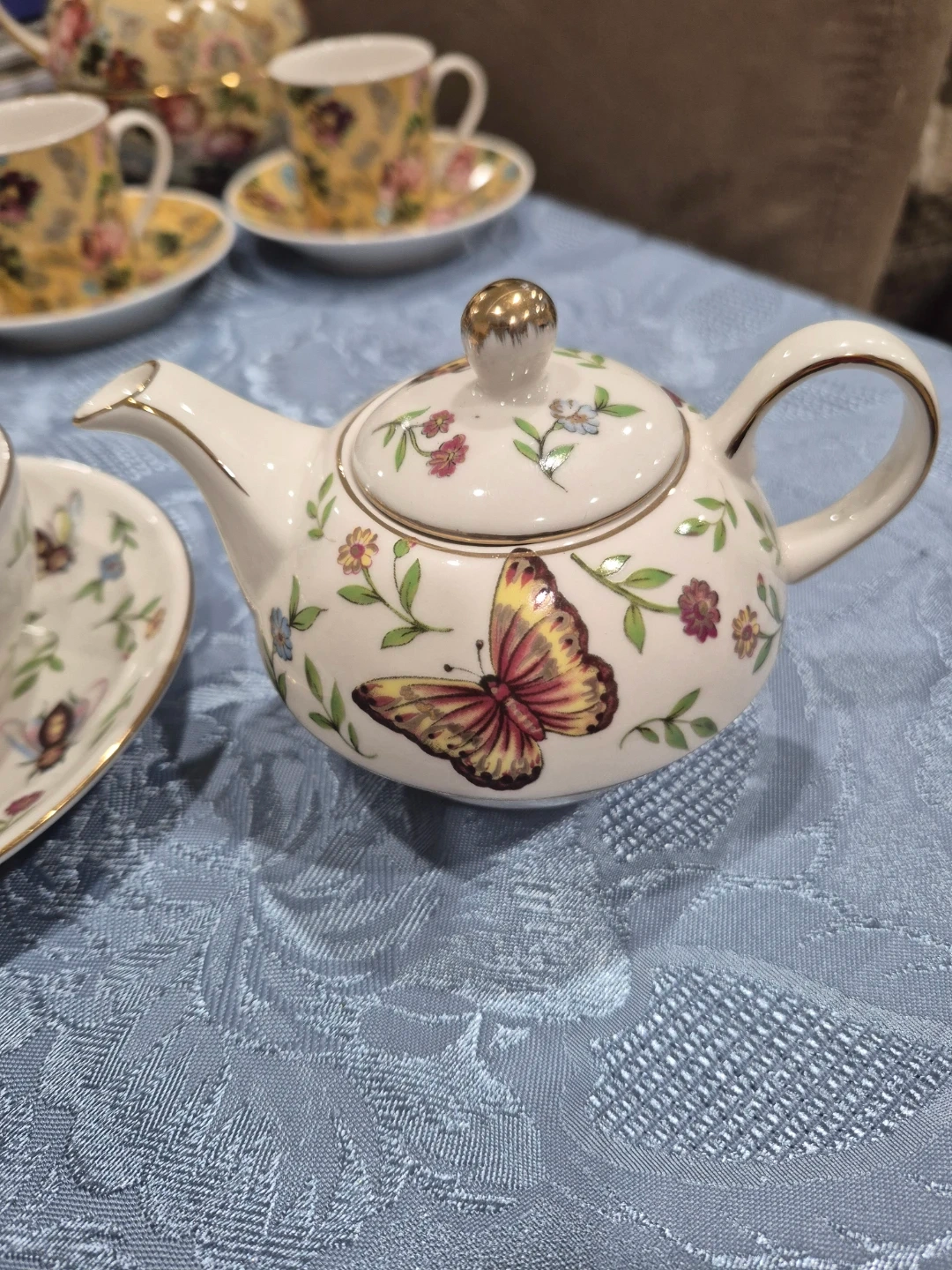 This is a lovely tea set featuring a teapot, cup, and saucer, all adorned with a beautiful butterfly design. Perfect for adding a touch of elegance to your tea time or as a charming display piece!