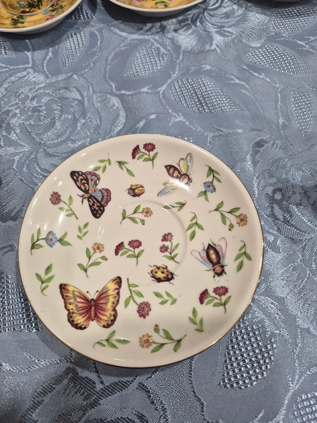 This is an Adeline tea cup and saucer set featuring a beautiful butterfly design. It's in great condition and would be a lovely addition to any tea set!
