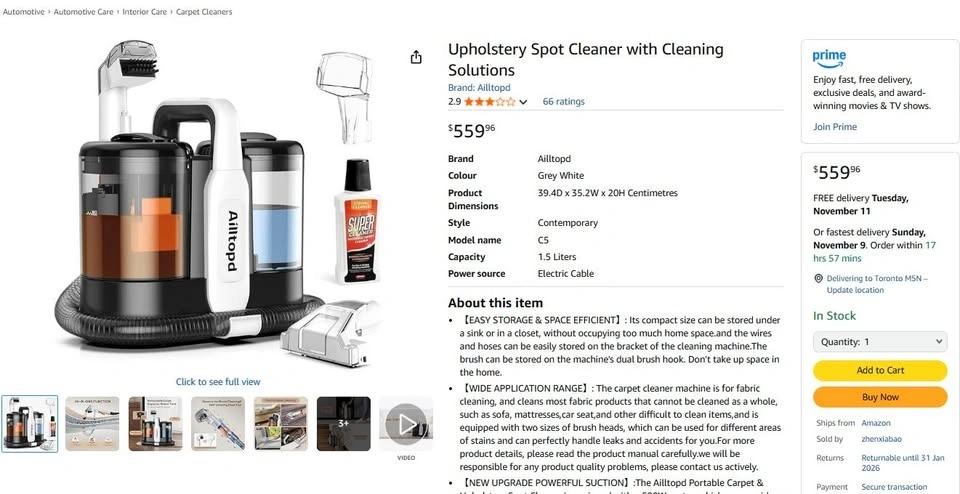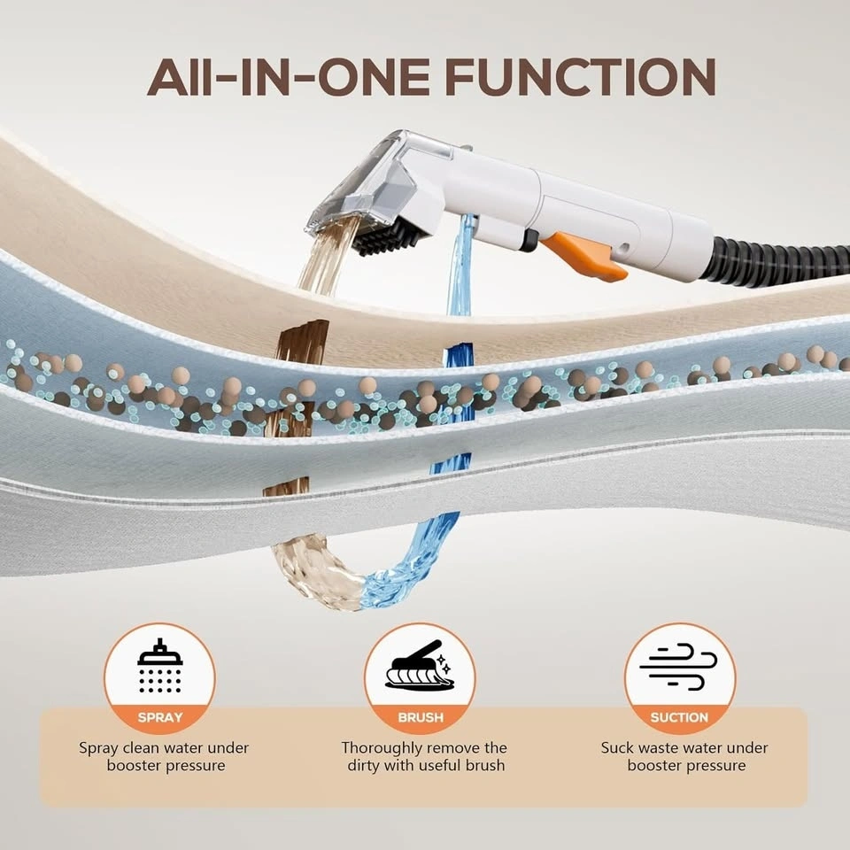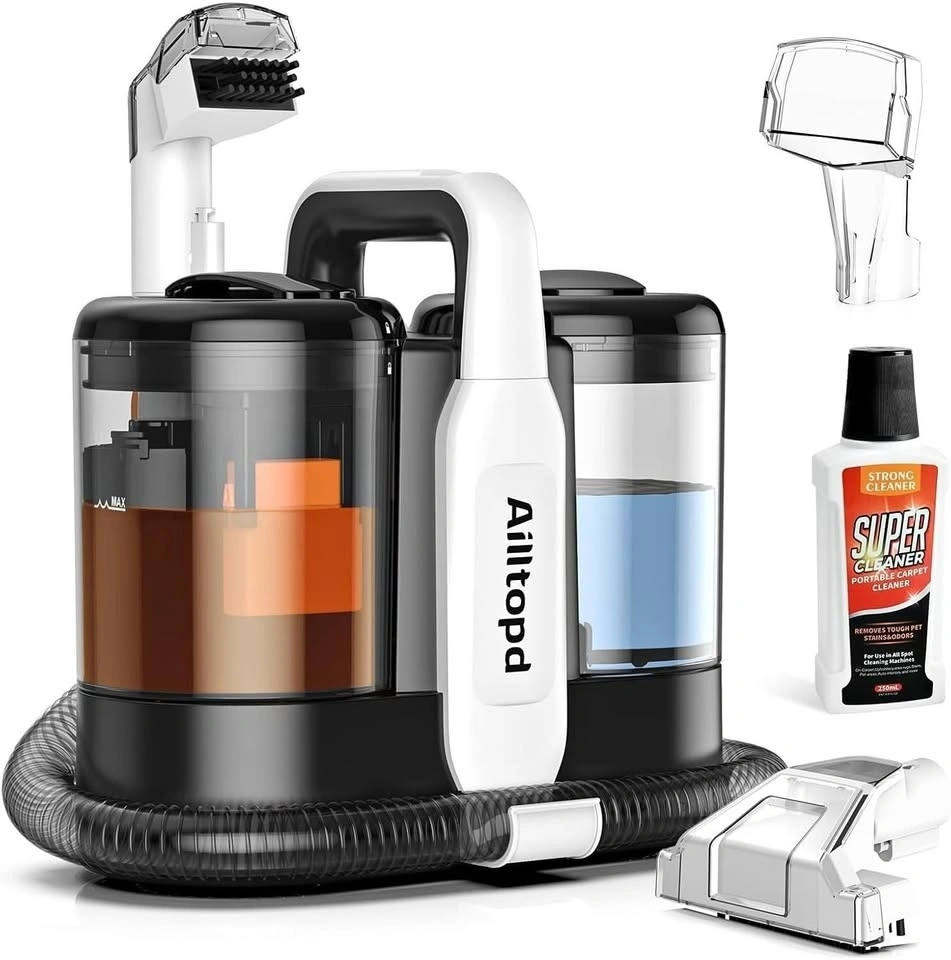 Ailltopd Portable Upholstery & Carpet Spot Cleaner. Powerful 500W suction with dual water tanks, long hose, and 2 brush heads. Perfect for sofas, car seats, carpets, and mattresses. Includes cleaning solution.