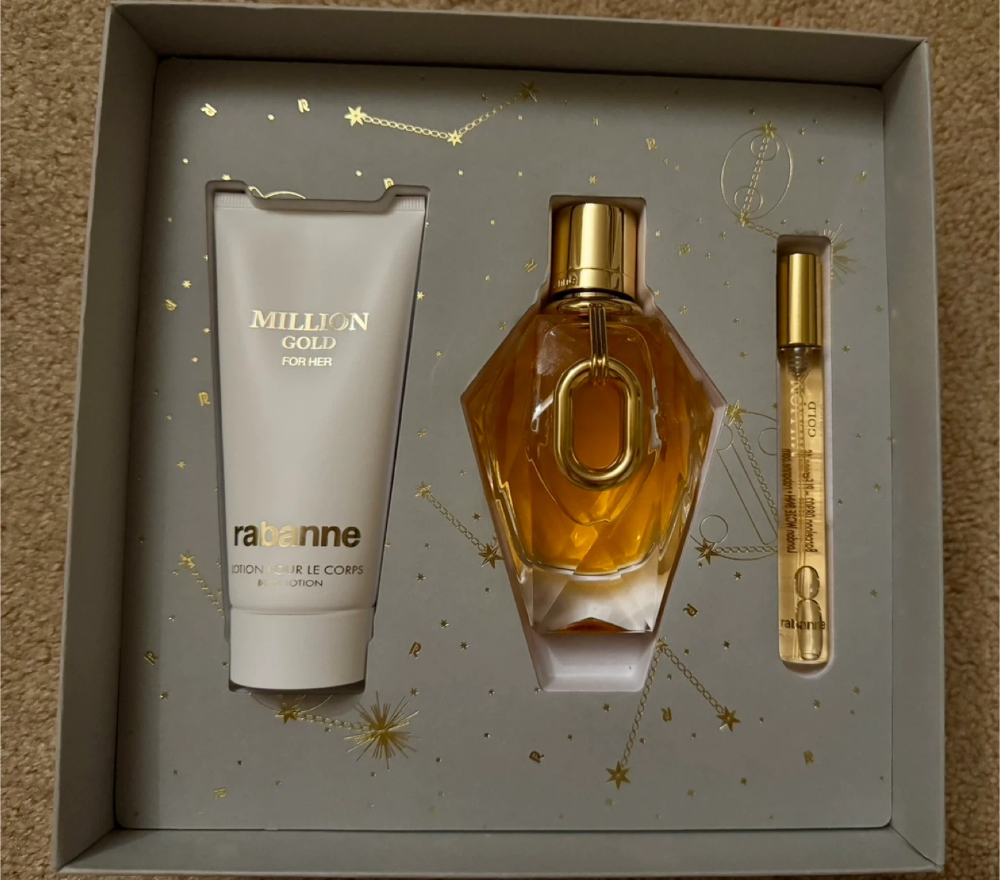 Selling a Rabanne Million Gold For Her gift set! The set includes a perfume, lotion, and travel-size perfume. The size is 100 mL. Originally bought for $210, valued at $250. The box is included