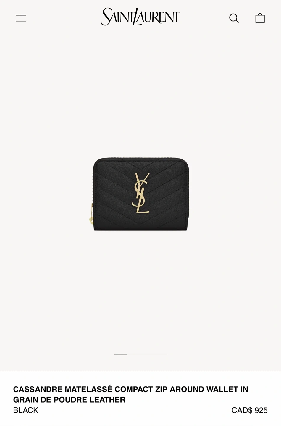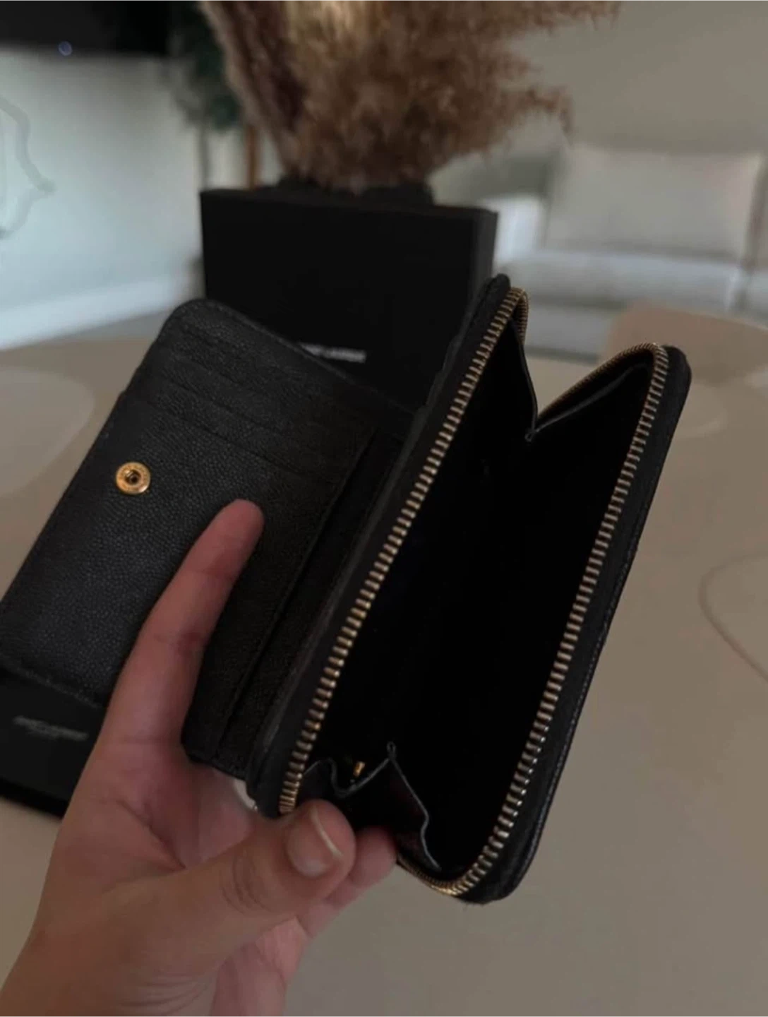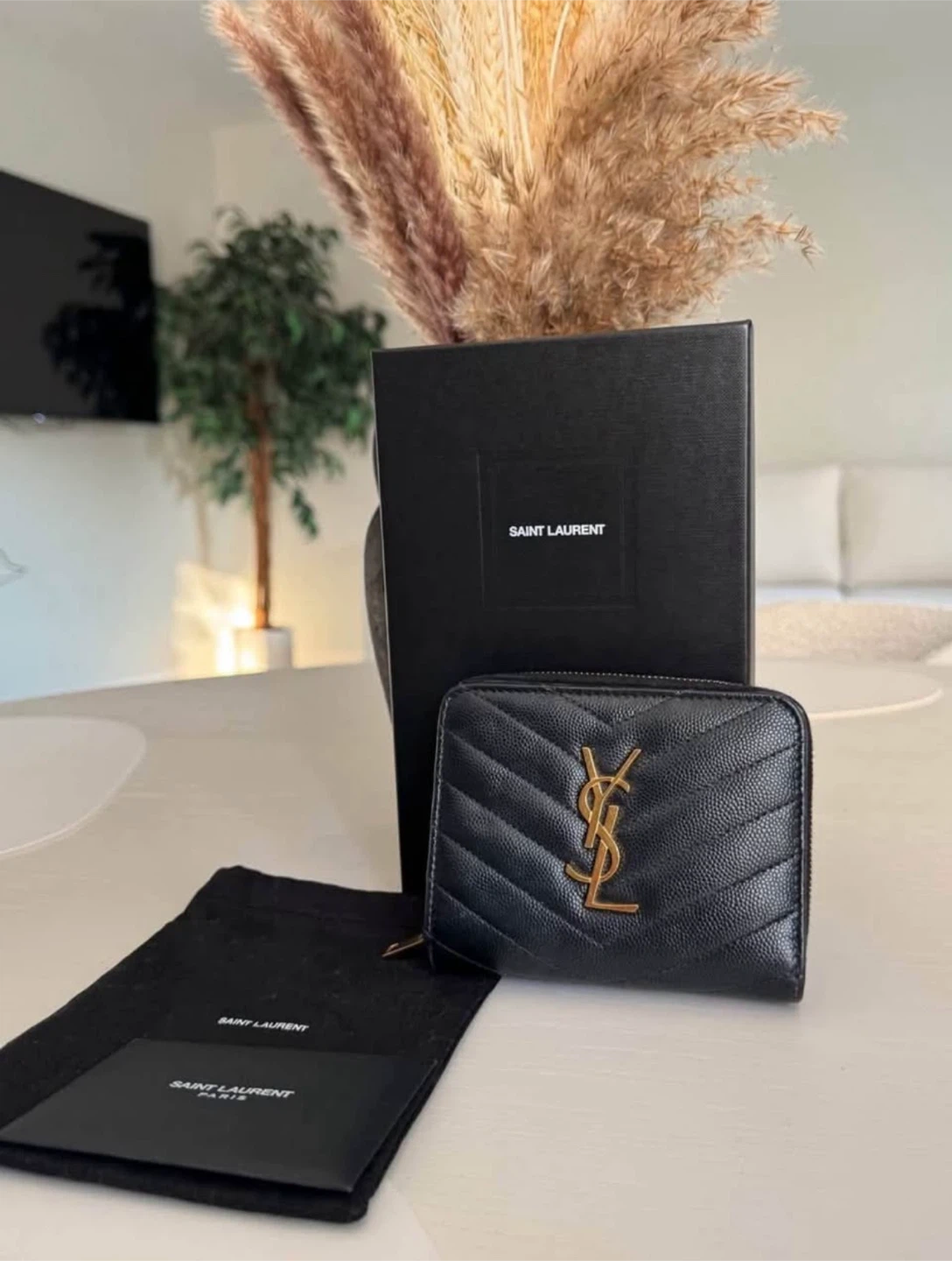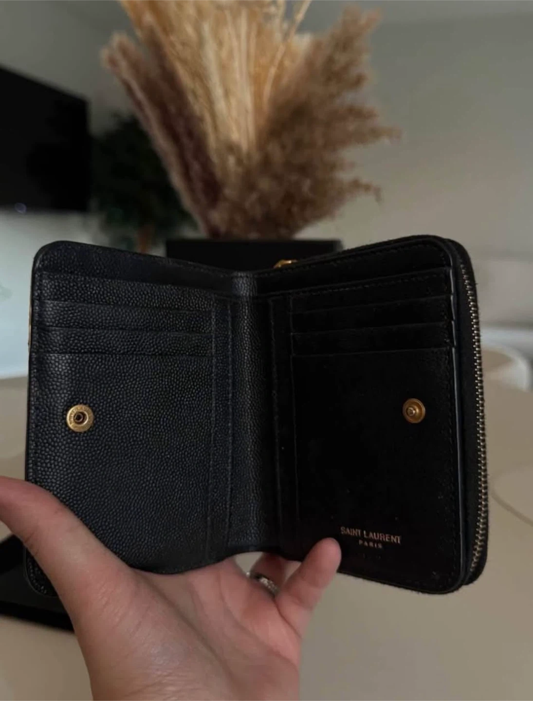 Selling a gently used Saint Laurent Cassandre Matelassé compact zip around wallet in black grain de poudre leather. It's in great condition and comes with the original box and dust bag. The wallet is a stylish and practical accessory!