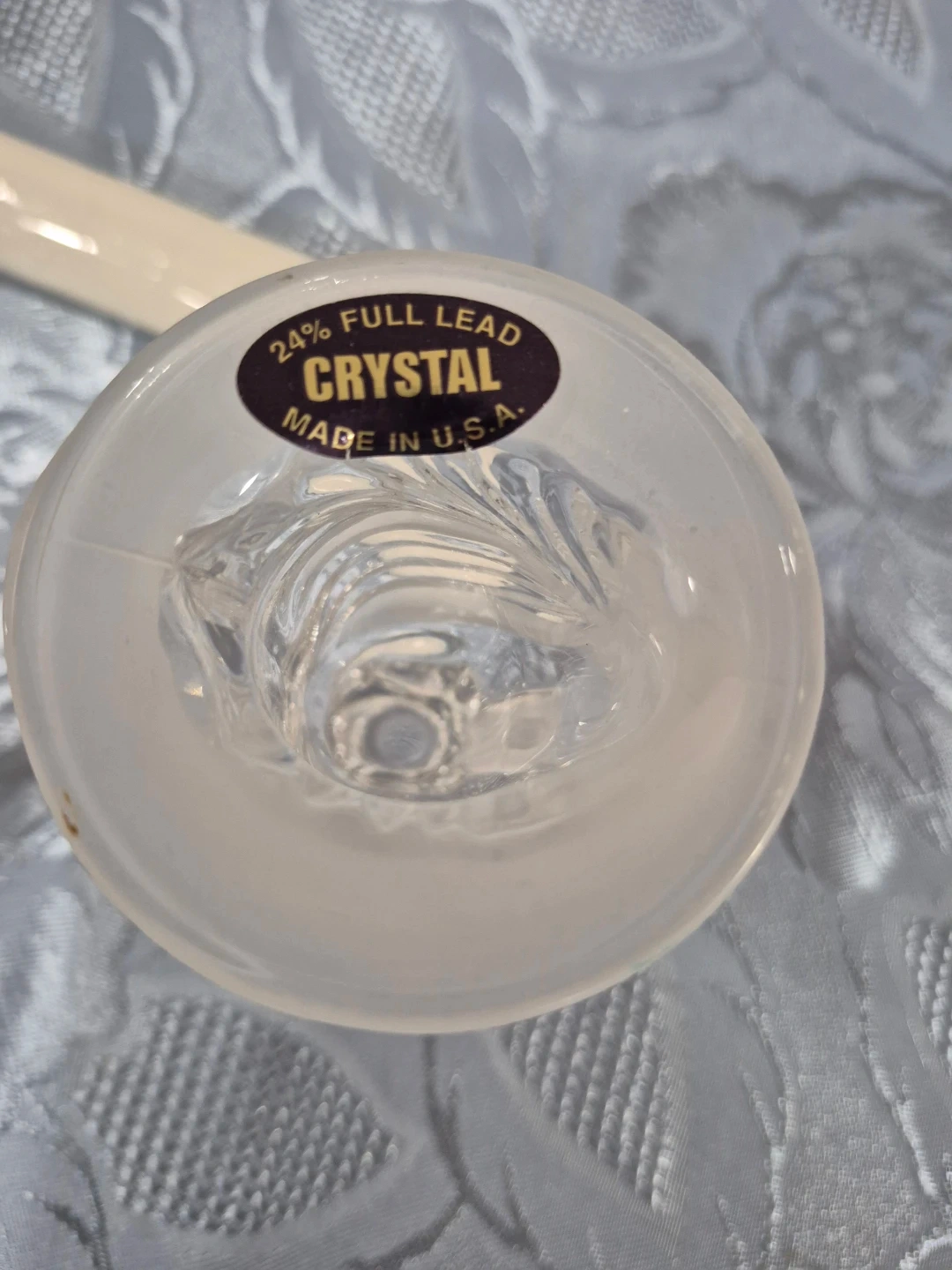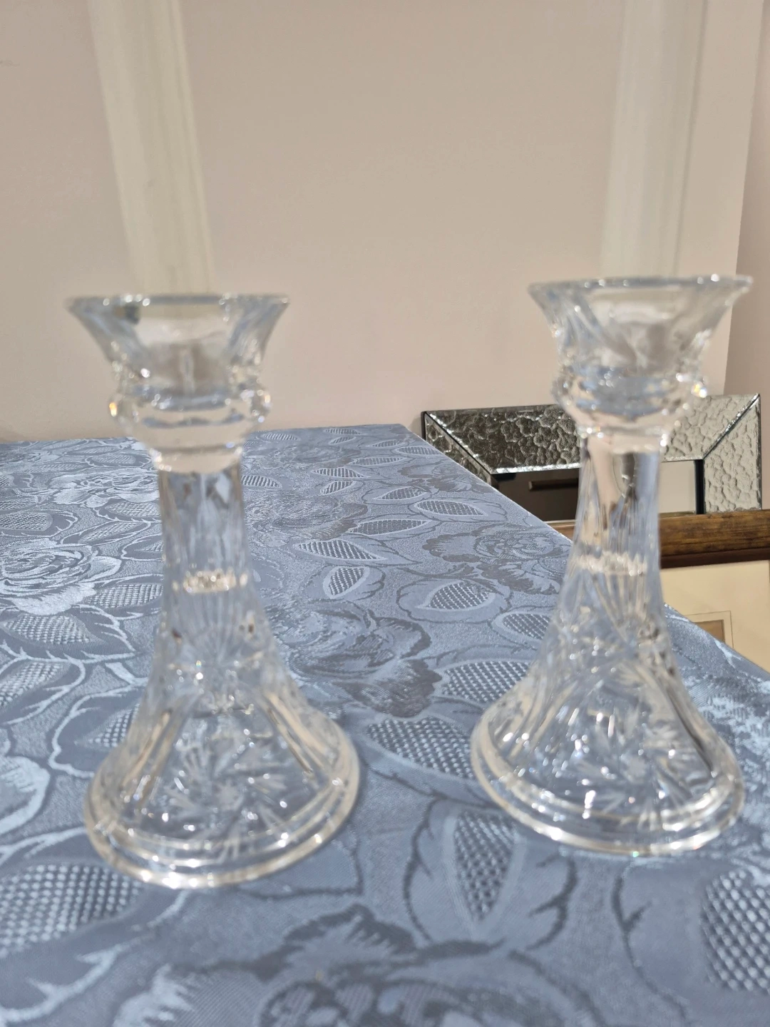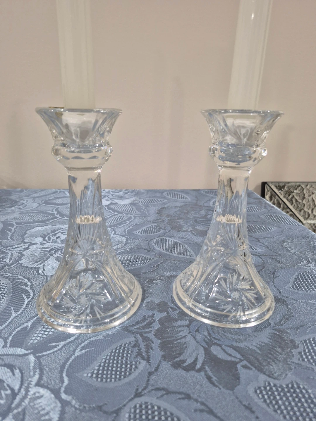 Selling a pair of lovely candlestick holders made of 24% full lead crystal. They were made in the USA and would look great on any table!