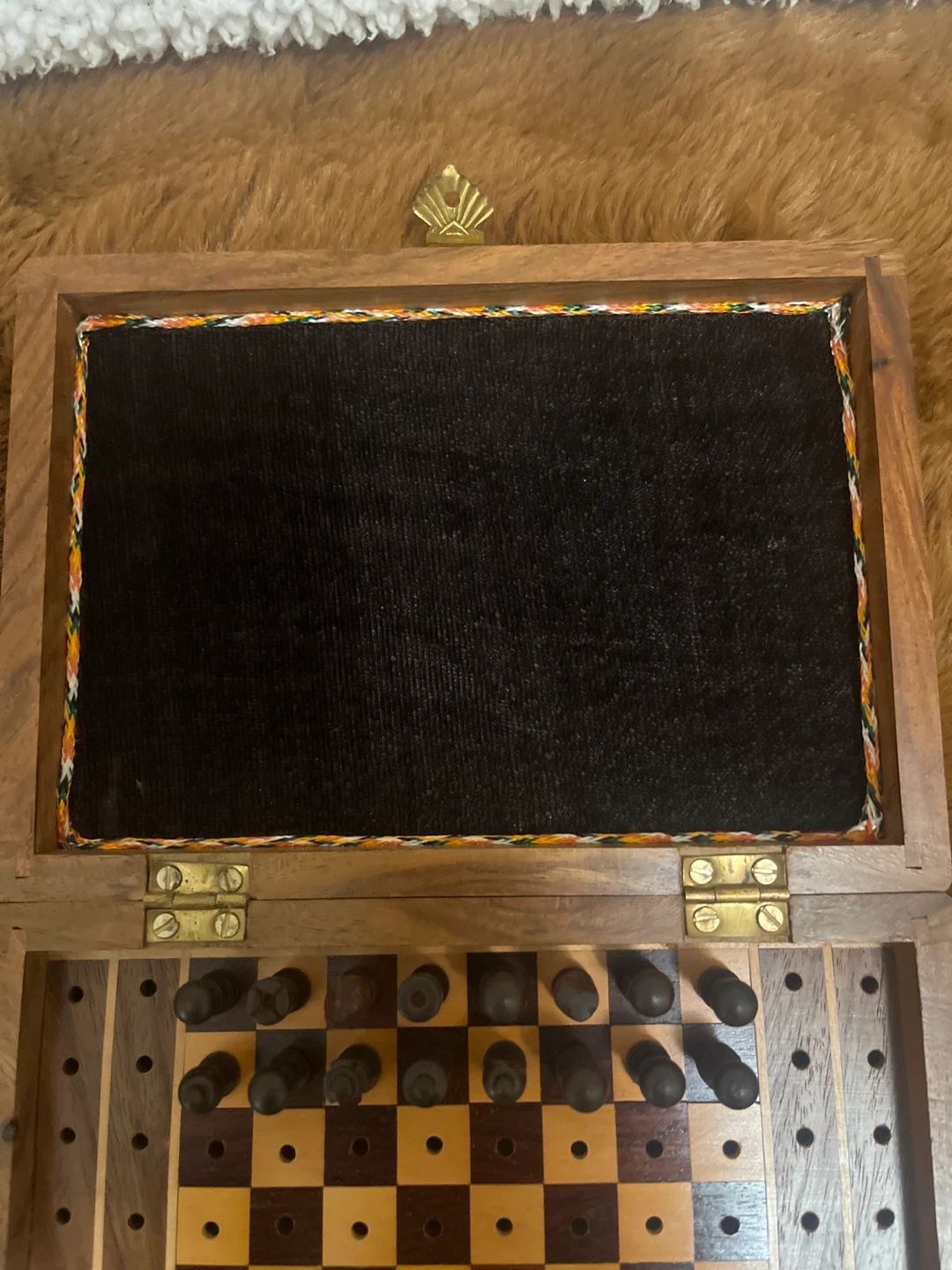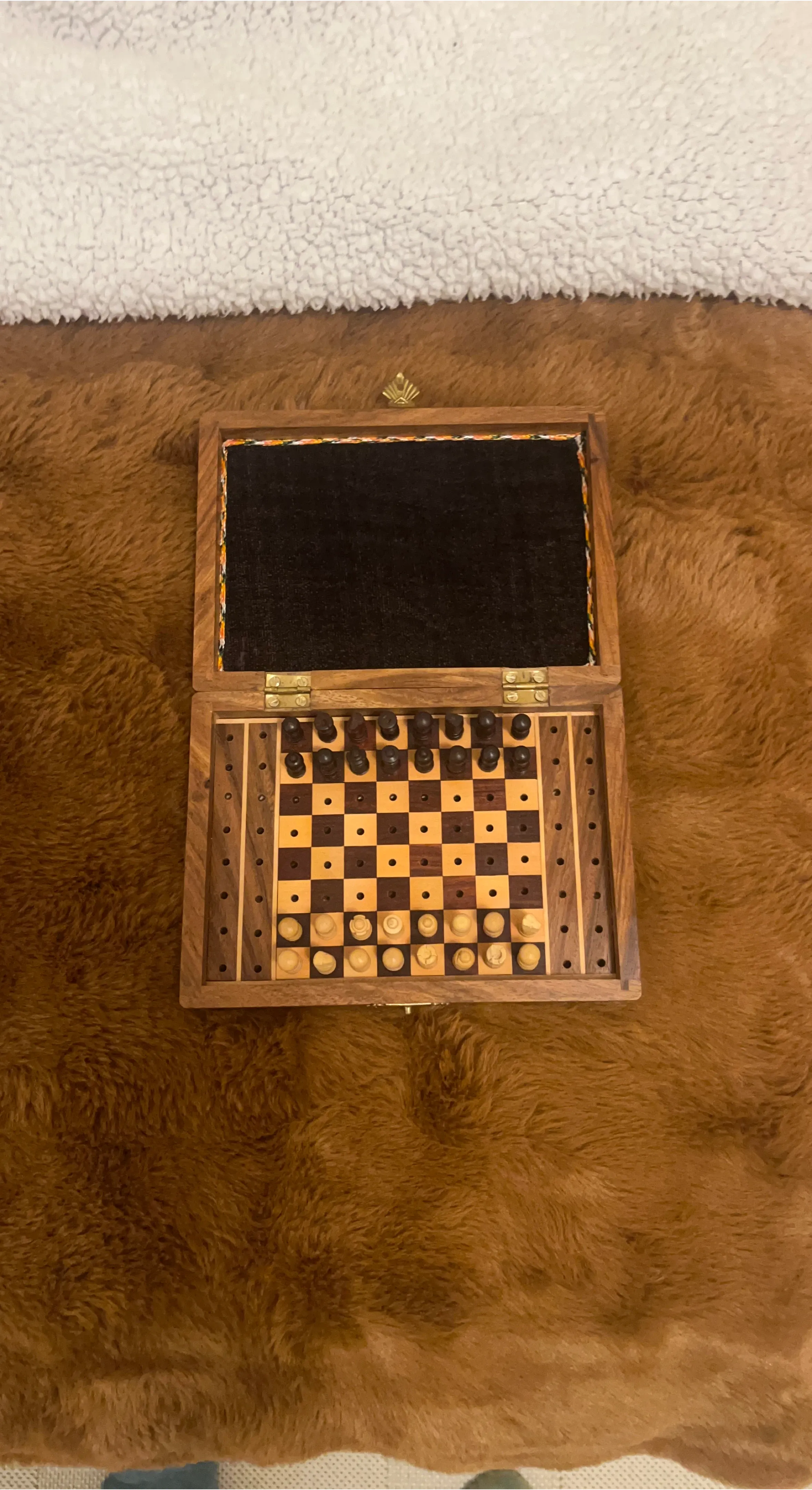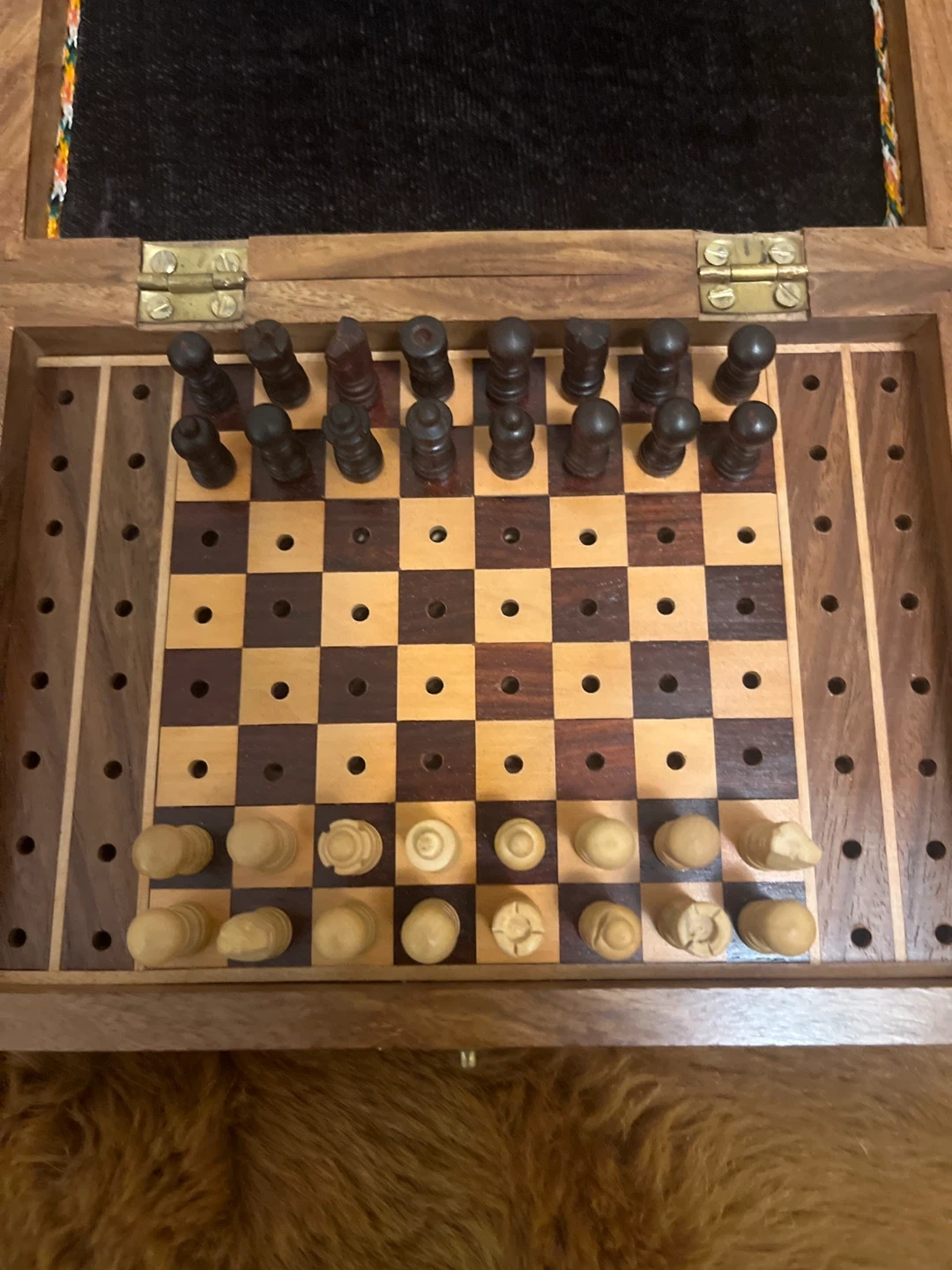 Selling a wooden travel chess set. It is a compact and portable set, perfect for playing on the go. The chess pieces are stored inside the wooden box, which also serves as the chessboard.