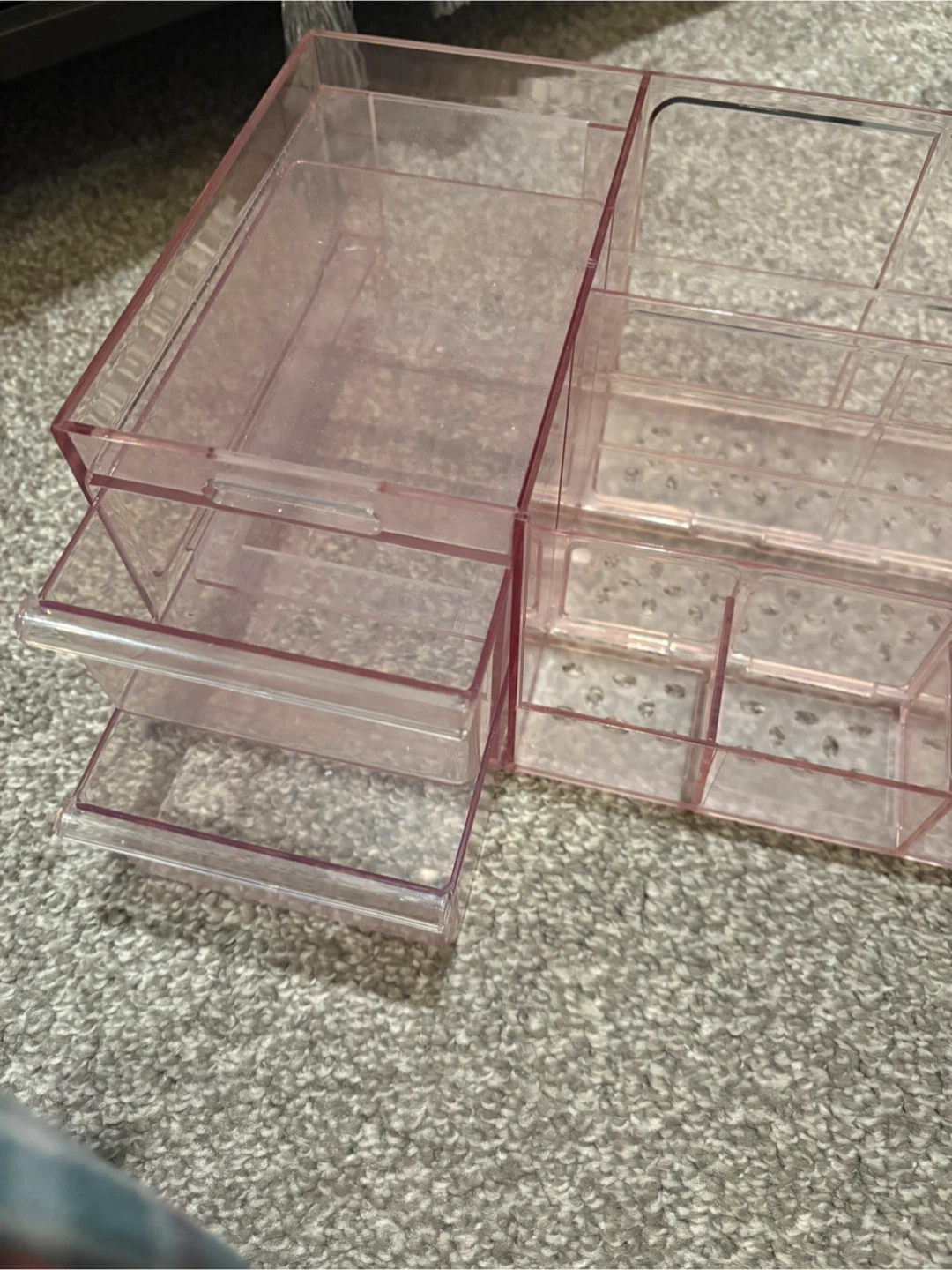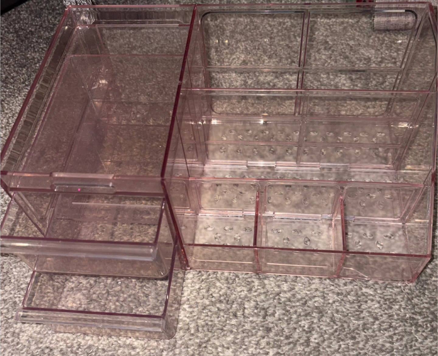 Selling a pink acrylic makeup organizer. It's in great shape and has lots of compartments for storing all your makeup and accessories. It has a drawer and different sized slots to keep everything organized!