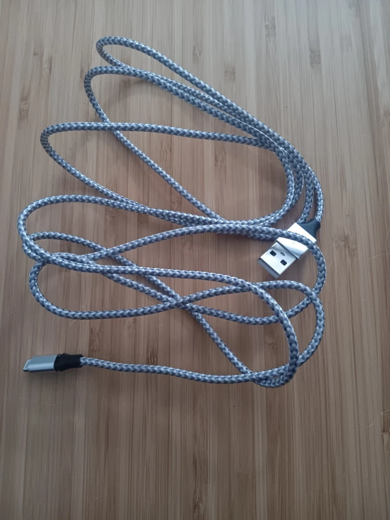 Selling a braided USB to Lightning cable. It has a gray and white braided design. There is some electrical tape on one end.