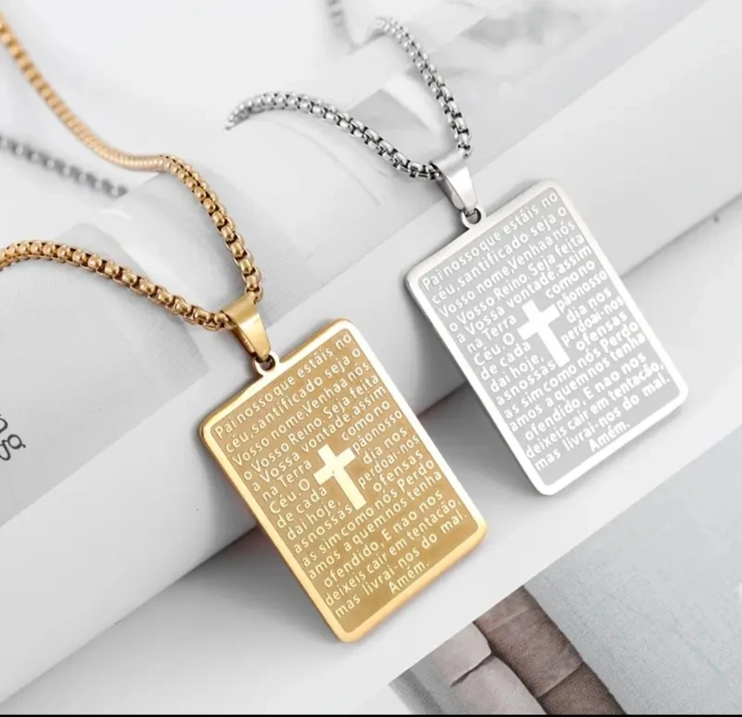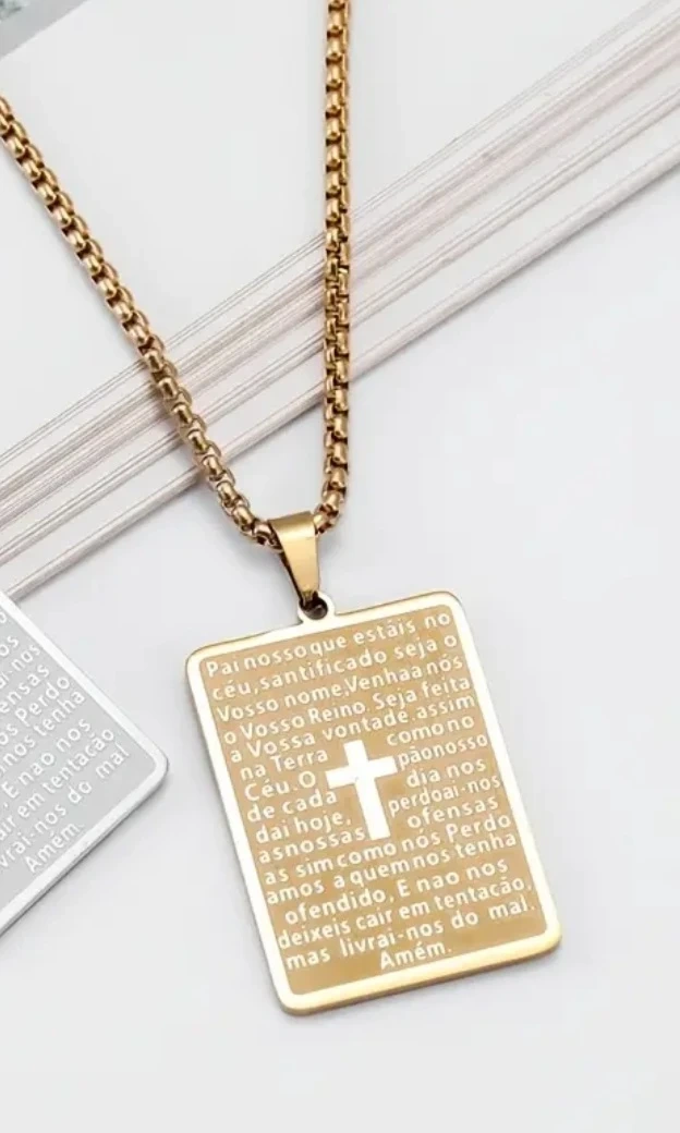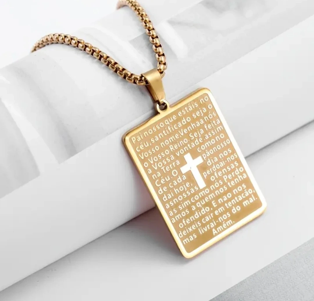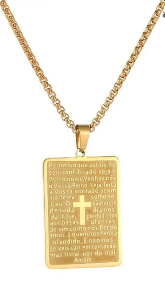 This is a gold-tone pendant necklace with the Lord's Prayer inscribed on the rectangular pendant. The pendant also features a cross. It's a beautiful piece!