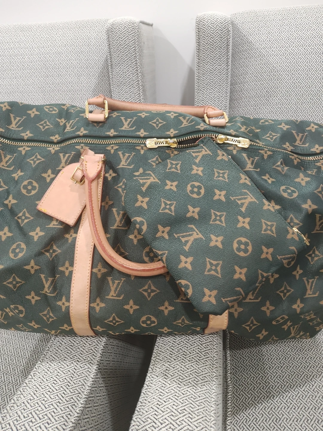 Here's a Louis Vuitton duffel bag with the classic monogram pattern! It's a stylish and spacious option for travel or everyday use. The bag features the iconic LV monogram throughout, with leather accents. It appears to be in good condition with some signs of wear.