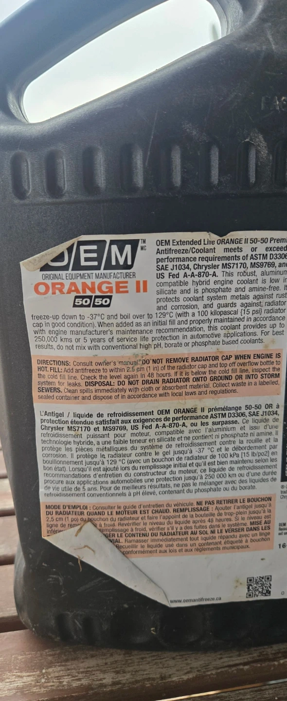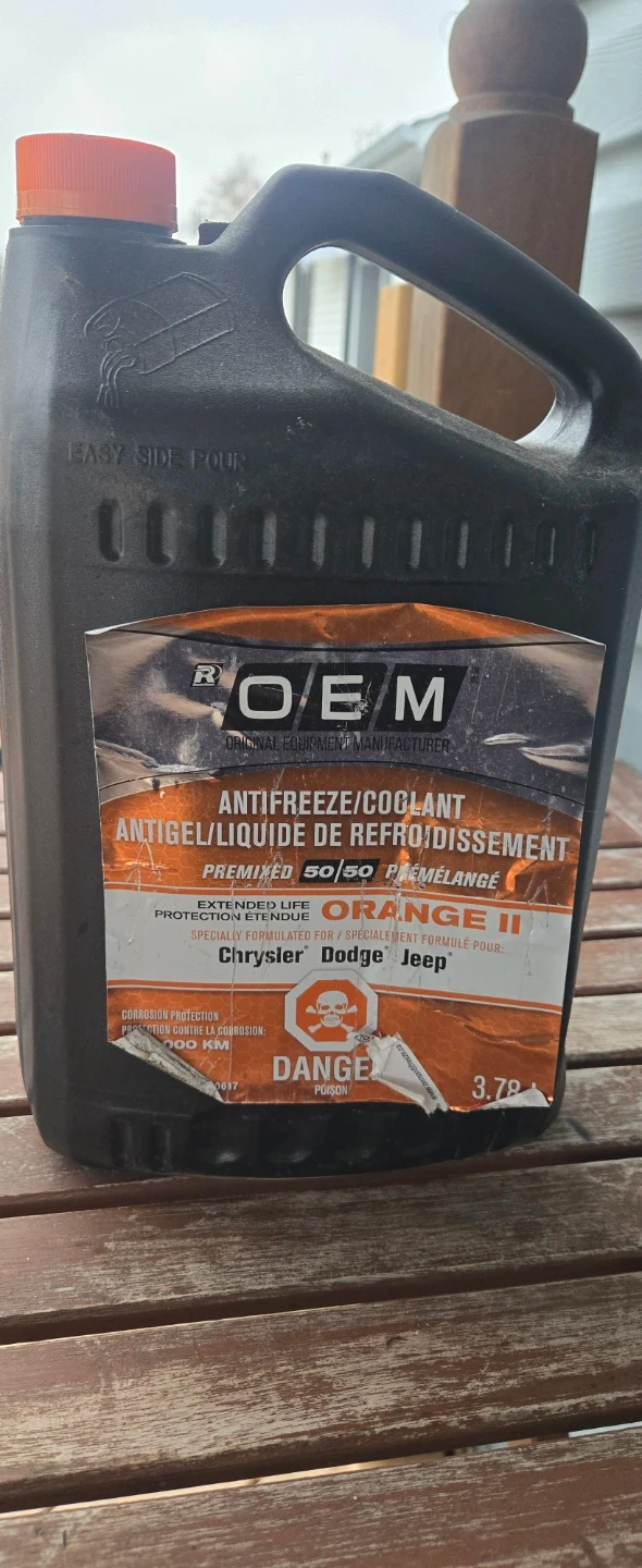 FREE!! OEM Orange II antifreeze/coolant. It's half empty. Specially formulated for Chrysler, Dodge, and Jeep vehicles, providing extended life and corrosion protection.