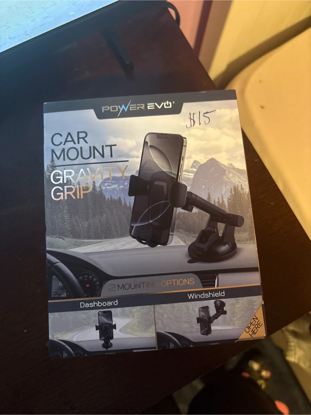 Selling a Power EVO car mount with a gravity grip! It offers two mounting options for either the dashboard or windshield.