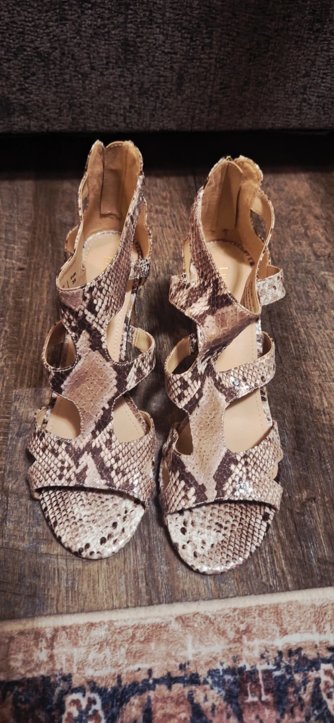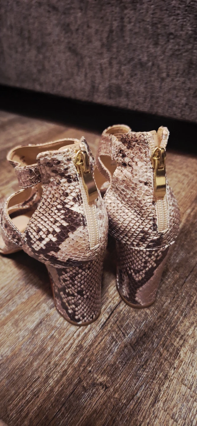 These heels feature a stylish snakeskin print. They are a size 9 and have a zipper closure at the back. Perfect for a night out!