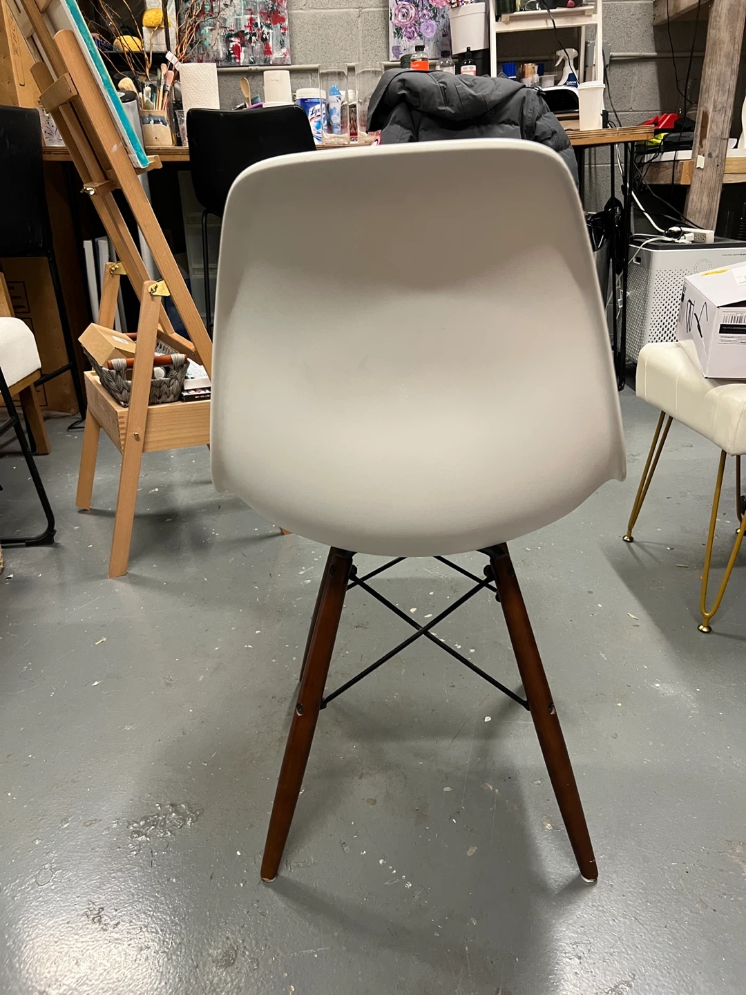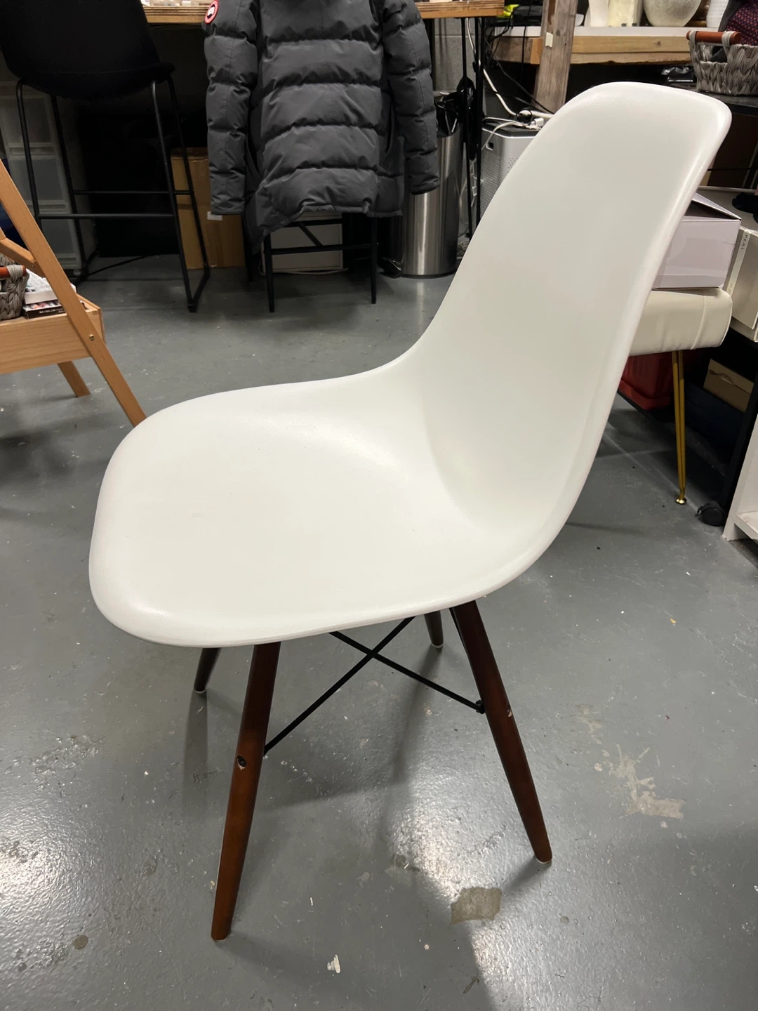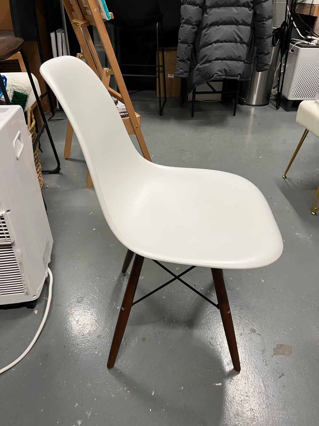 Here's a stylish white molded plastic dining chair with wooden legs! It's perfect for adding a modern touch to any room. The chair is in great condition and ready for a new home