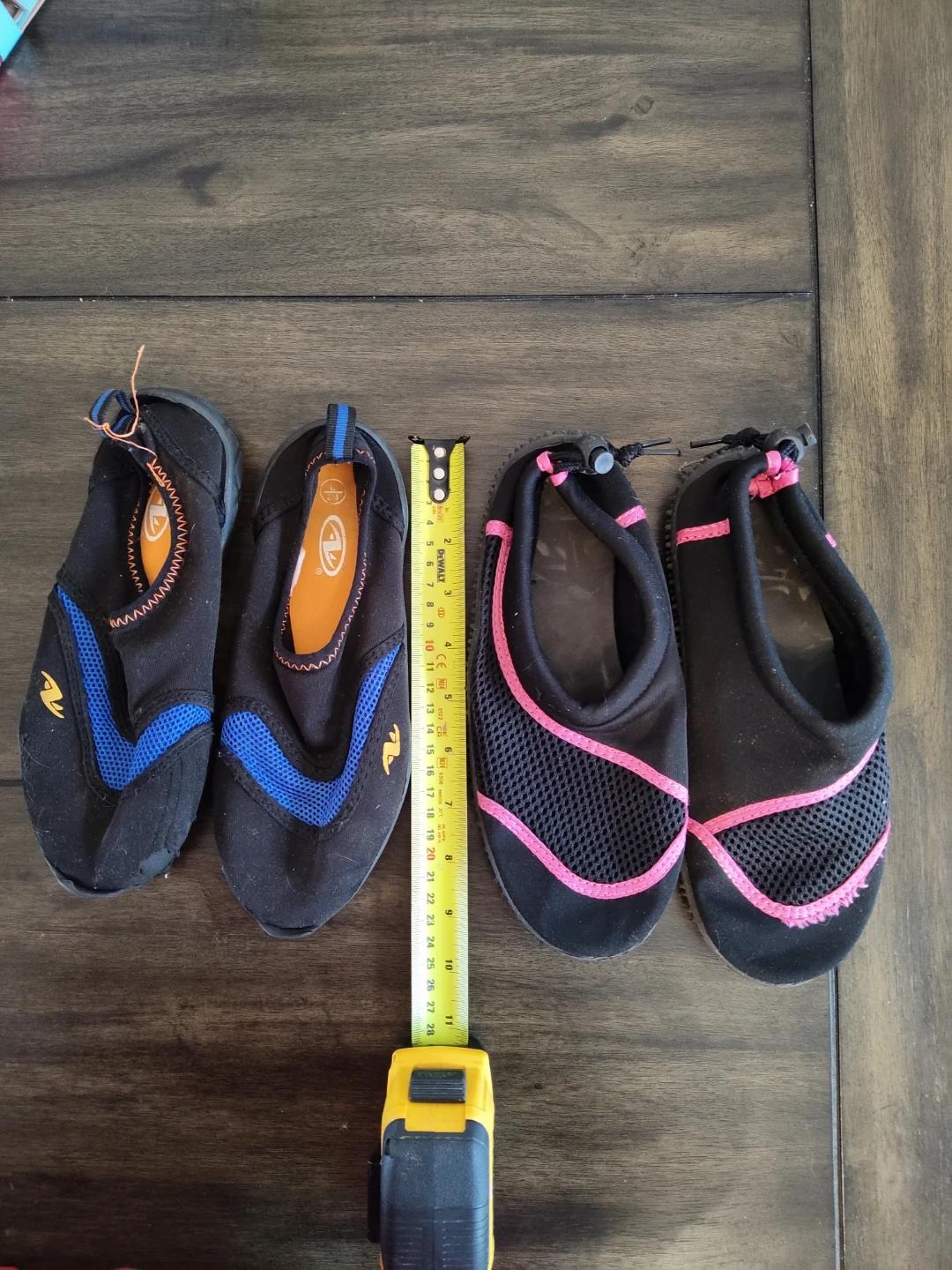 Selling two pairs of water shoes! One pair is black with blue accents, and the other is black with pink accents. They both are measuring approximately 24cm with a measuring tape