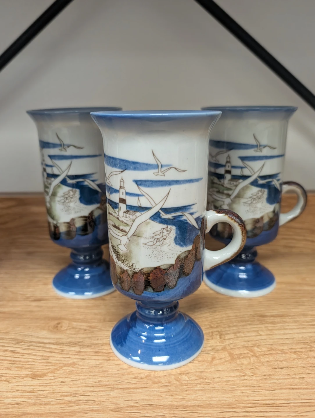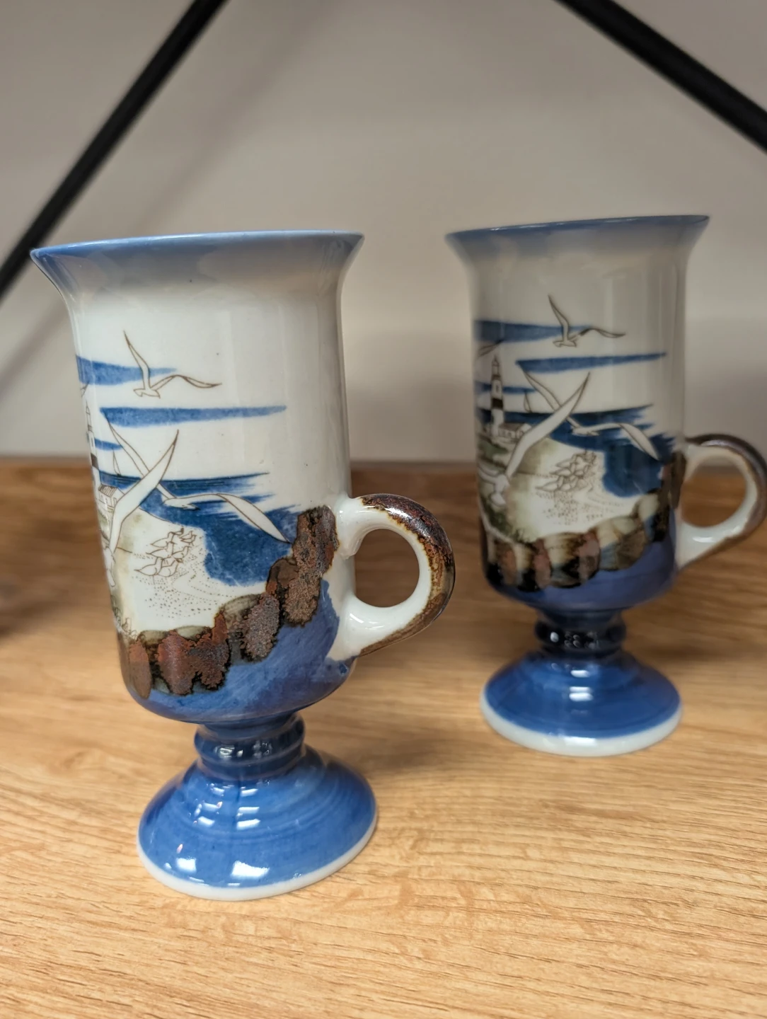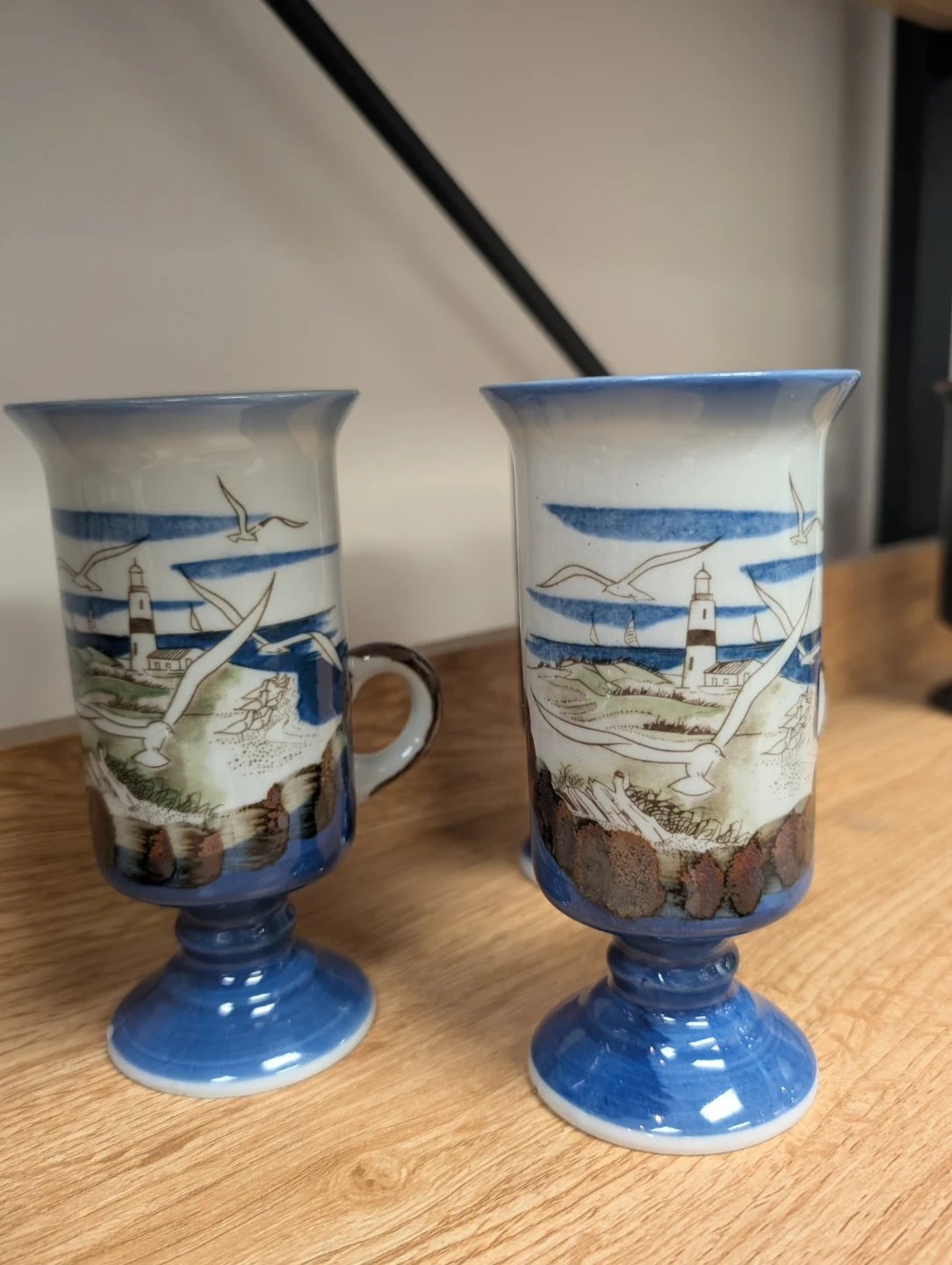 These are some lovely ceramic mugs featuring a nautical scene with a lighthouse and seagulls. They're in great shape and would be perfect for enjoying your favourite hot beverage!