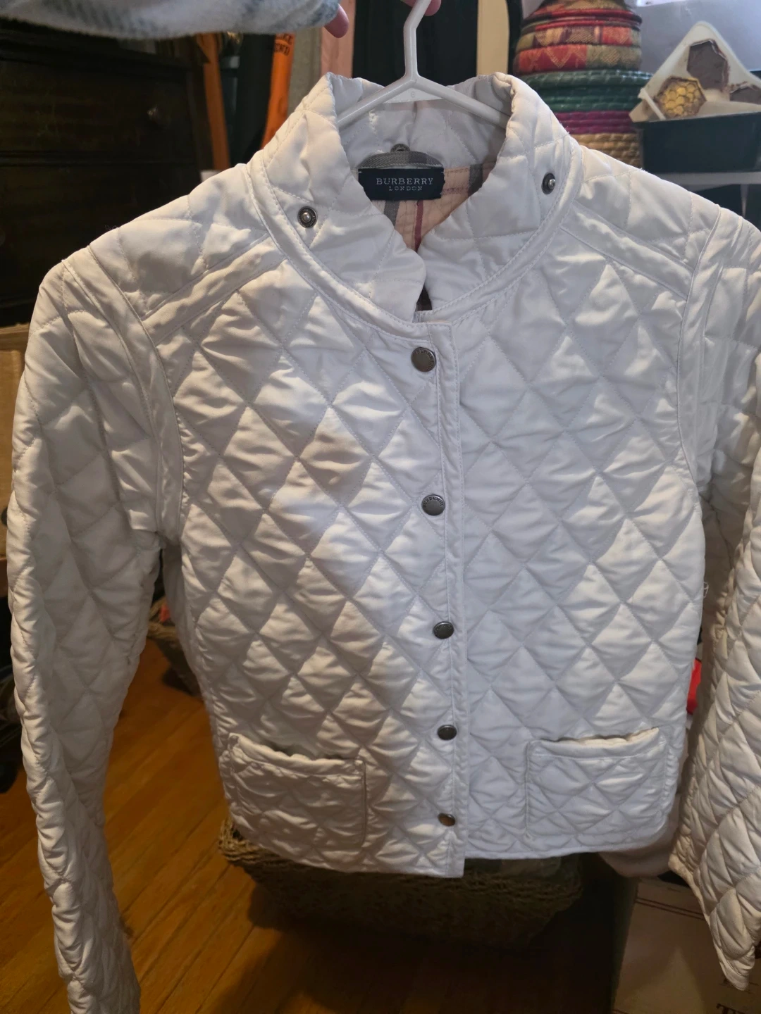 Selling a Burberry London quilted jacket in a lovely white colour. It's a size medium and in good condition. Perfect for adding a touch of class to your wardrobe.