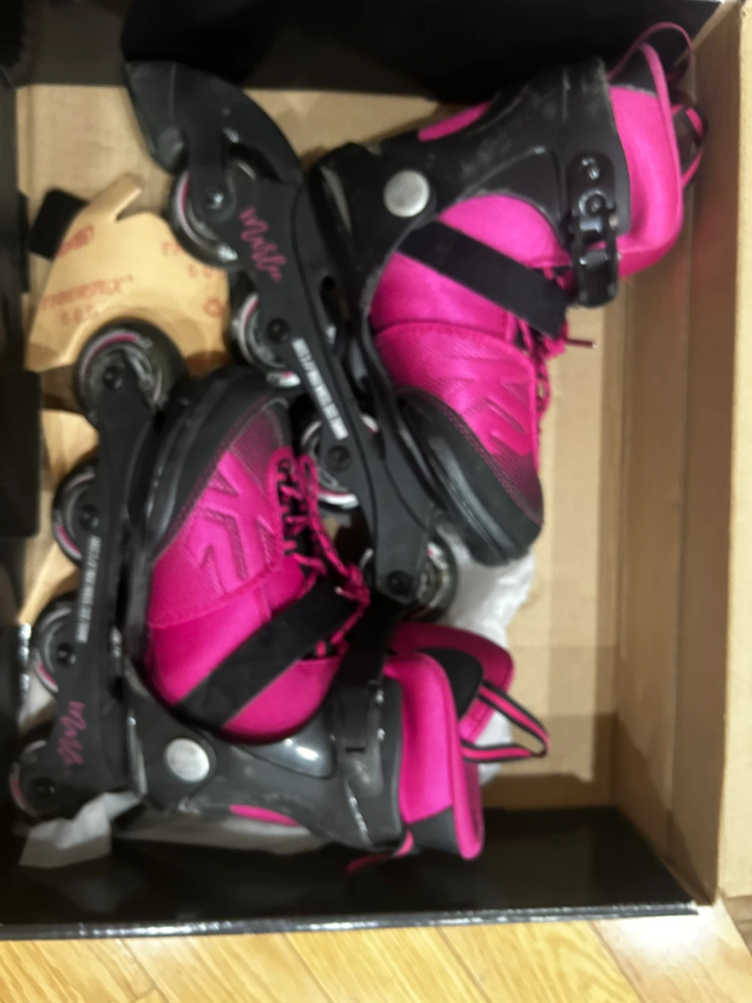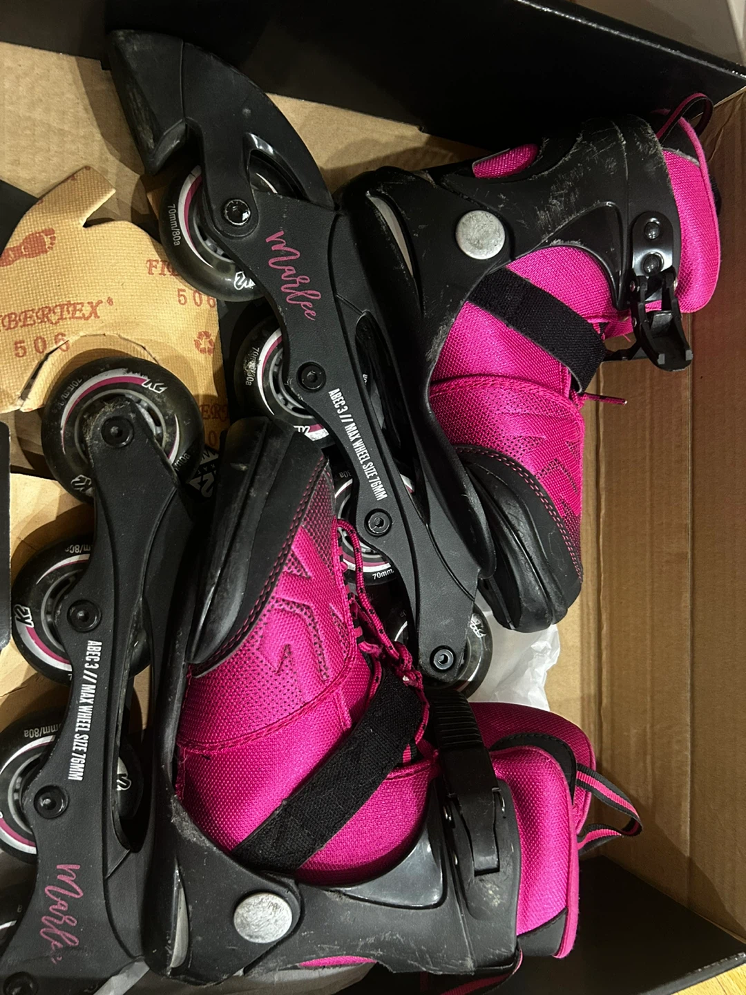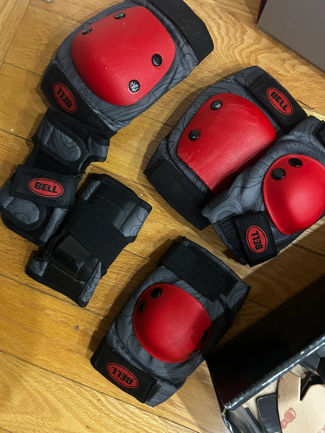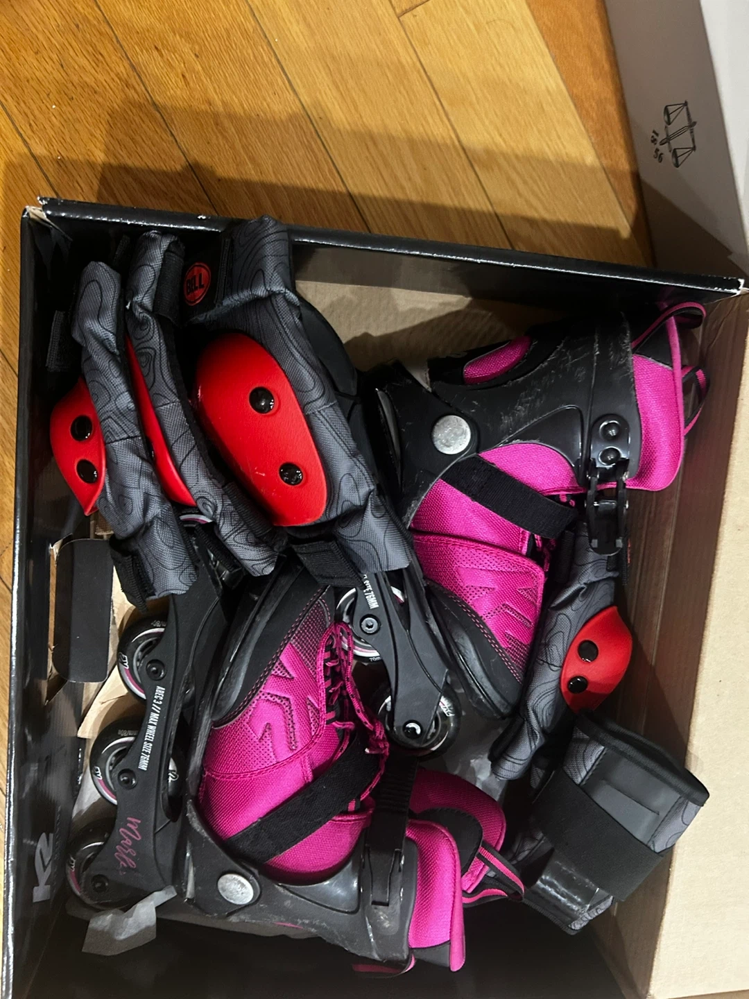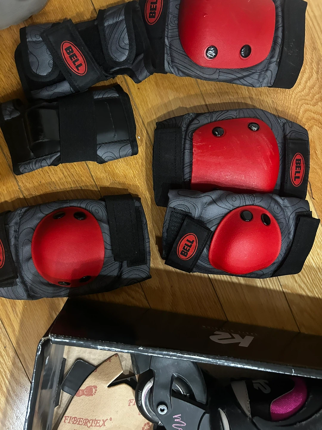 Selling a pair of K2 roller blades, complete with Bell protective gear. The set includes knee pads, elbow pads, and wrist guards, all in matching colours. Perfect for anyone looking to get into rollerblading safely! Adjustable size 2-5 kids