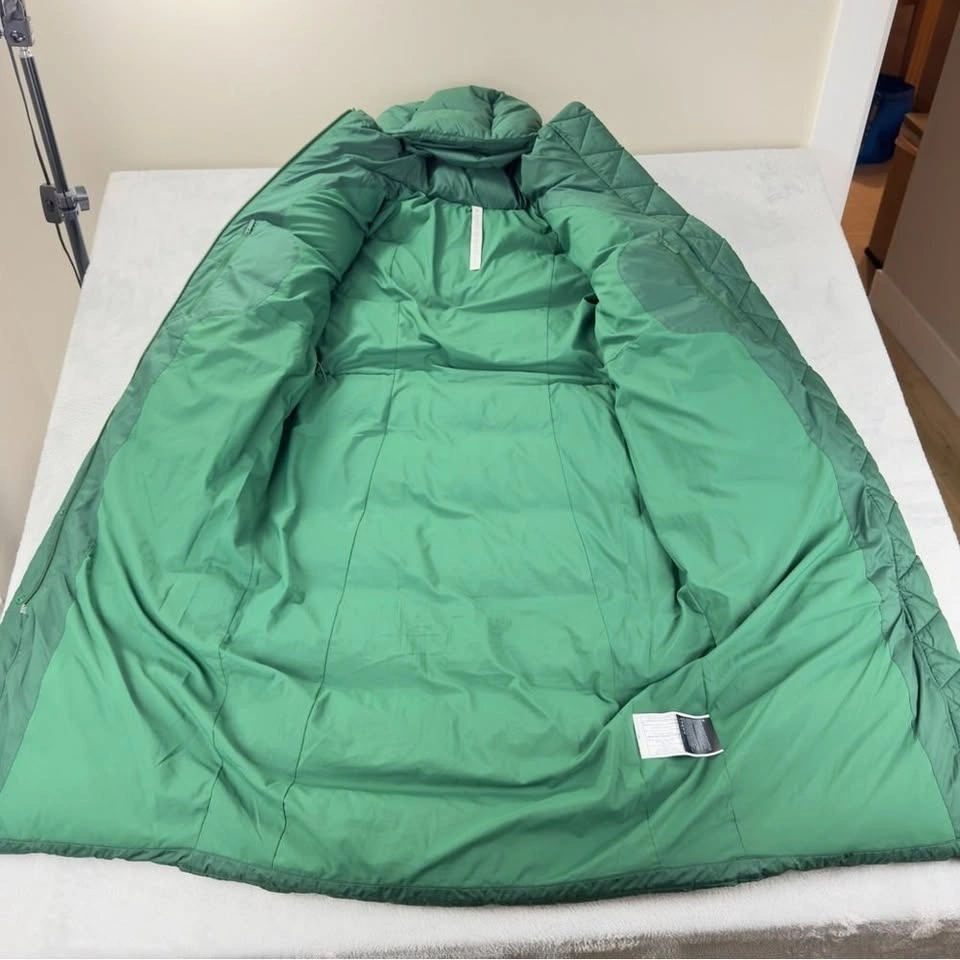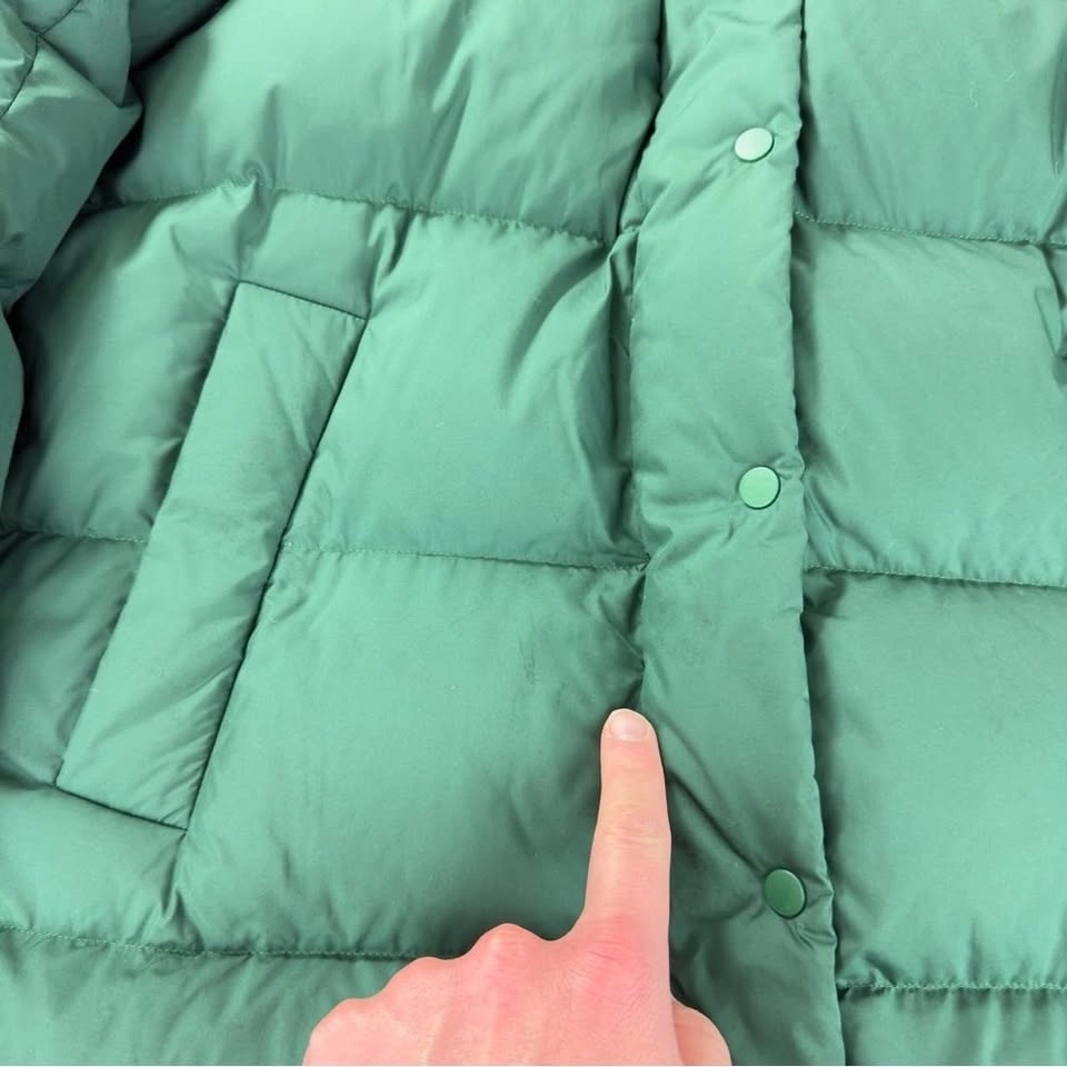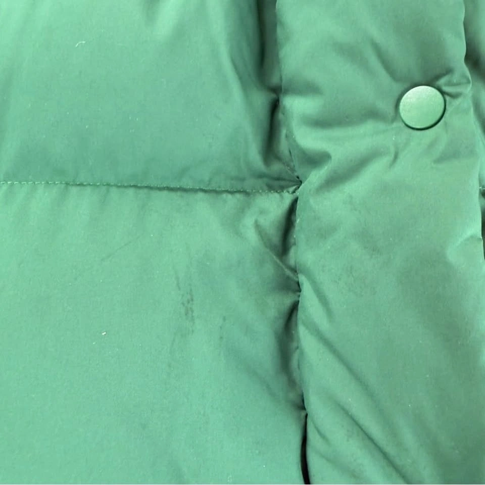 Lululemon Women's Size 6 Wunder Puff Jacket Long Everglade Green W4BTPS Style in good pre owned condition as shown in the photos with staining on the chest area near the right pocket, bottom right front of the jacket and left front arm near the shoulder.
