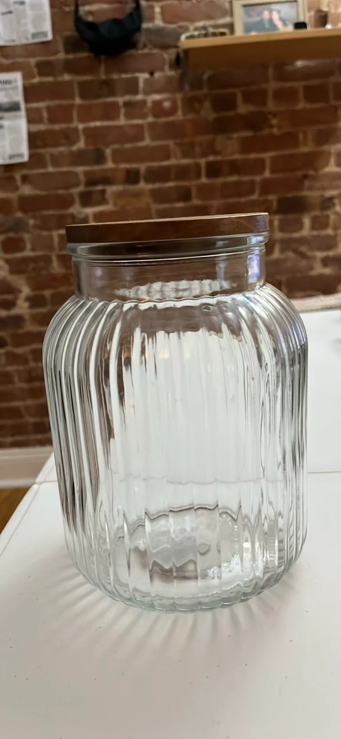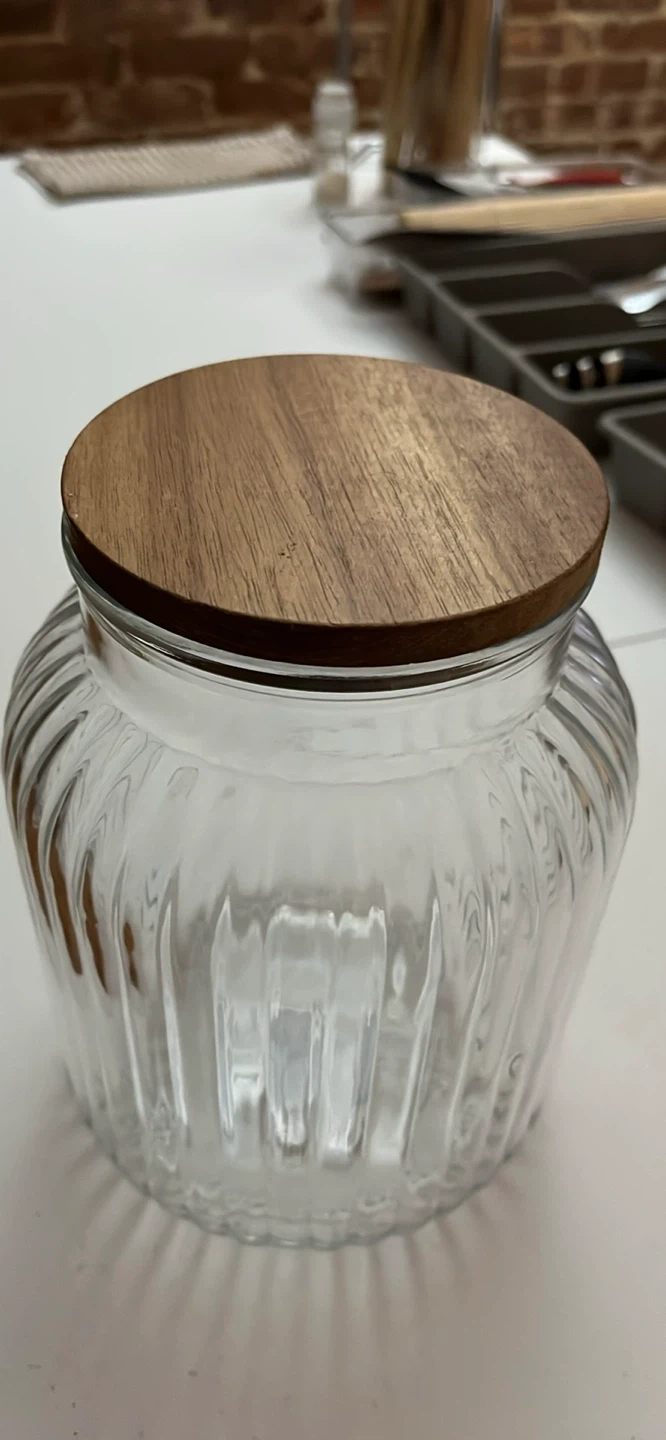 Selling a stylish glass jar with a wooden lid. It's in great condition and perfect for storing various items around the house. The jar has a nice ribbed design that adds a touch of elegance to any space