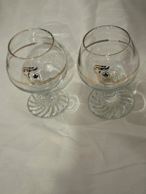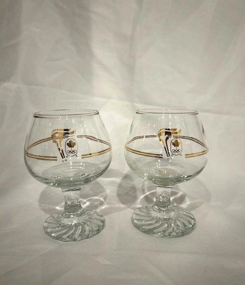 Celebrate Canadian Olympic history with this pair of vintage brandy glasses from the 1988 Calgary Winter Olympics. Each glass features a gold and black torch design with the iconic Olympic rings and maple leaf.