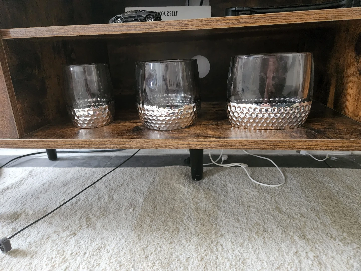 Selling a set of glasses with a silver accent. They look great on a shelf or bar! There are three candle glasses in total, each with a slightly different size.