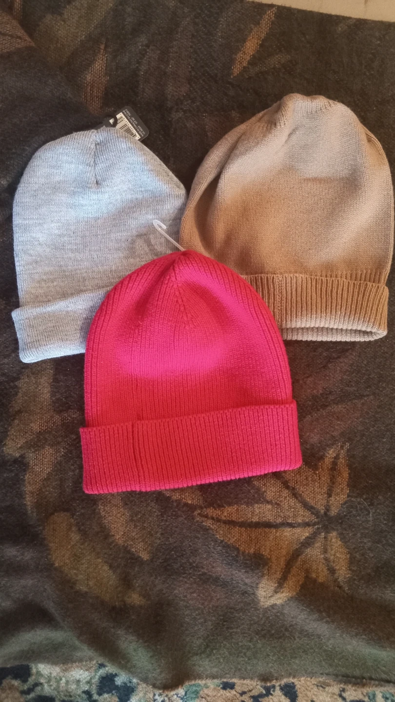 Selling three winter hats in great condition! There's a pink one, a grey one, and a beige one. Perfect for keeping warm this winter!