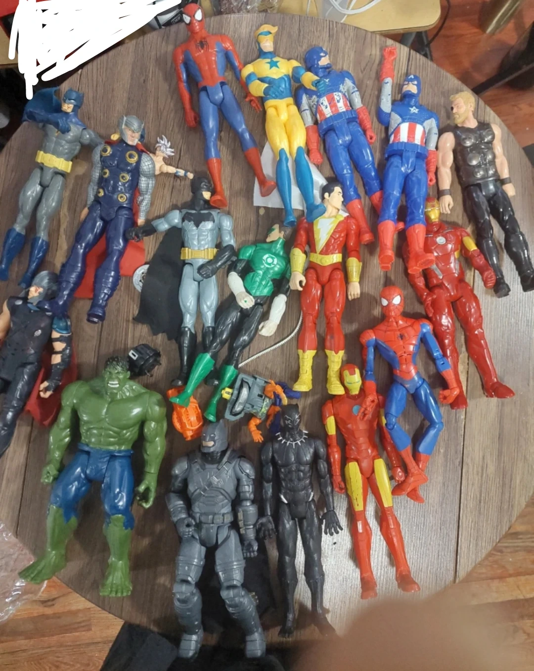 Selling a collection of superhero action figures. Includes characters like Batman, Superman, Spiderman, Iron Man, and more.