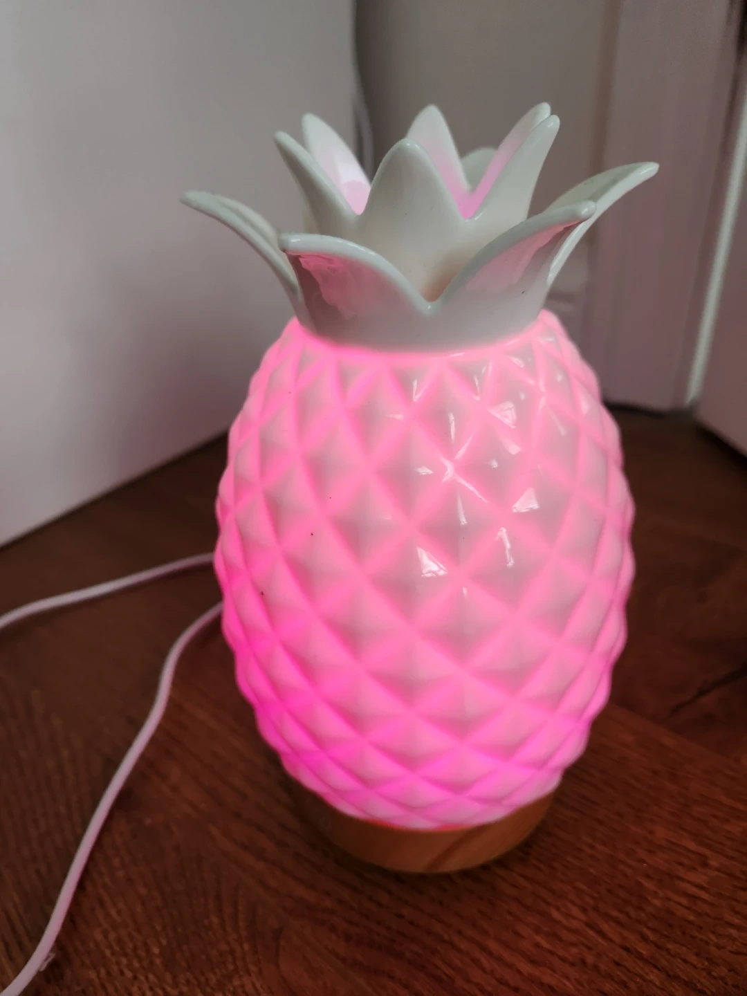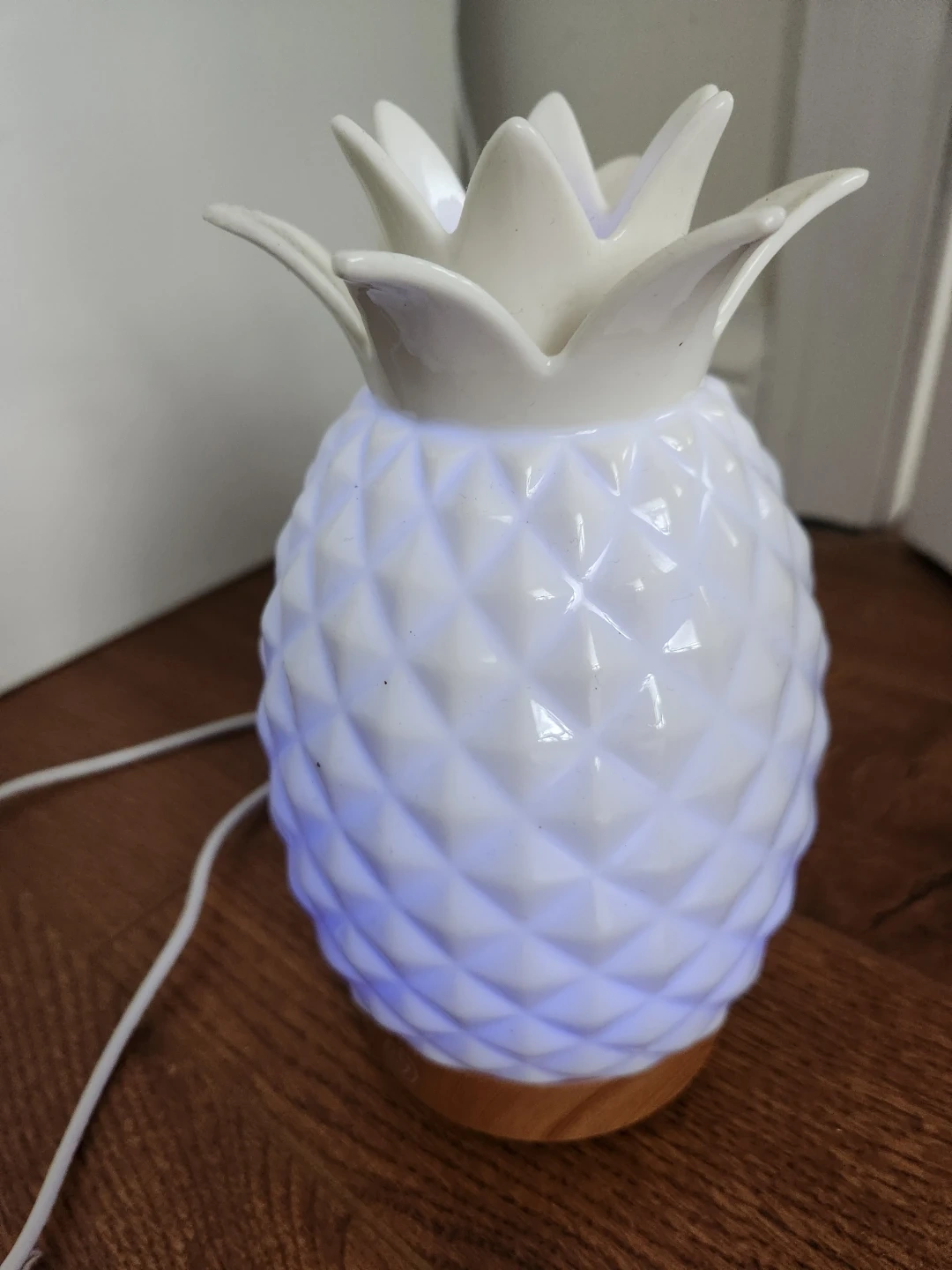 I'm selling a cute pineapple-shaped essential oil diffuser! It has a wooden base and a white ceramic top. It cycles through different colours when it's on, which is pretty cool. It's in great condition and would look great in any room. Comes with a bottle of patchouli essential oil.