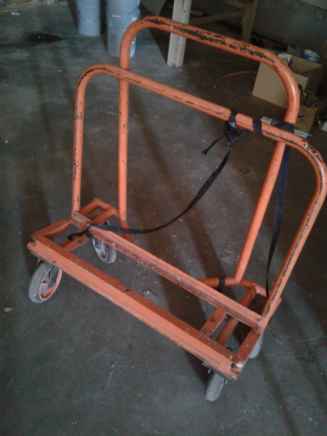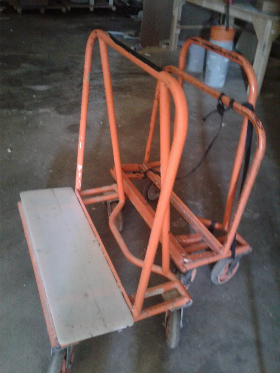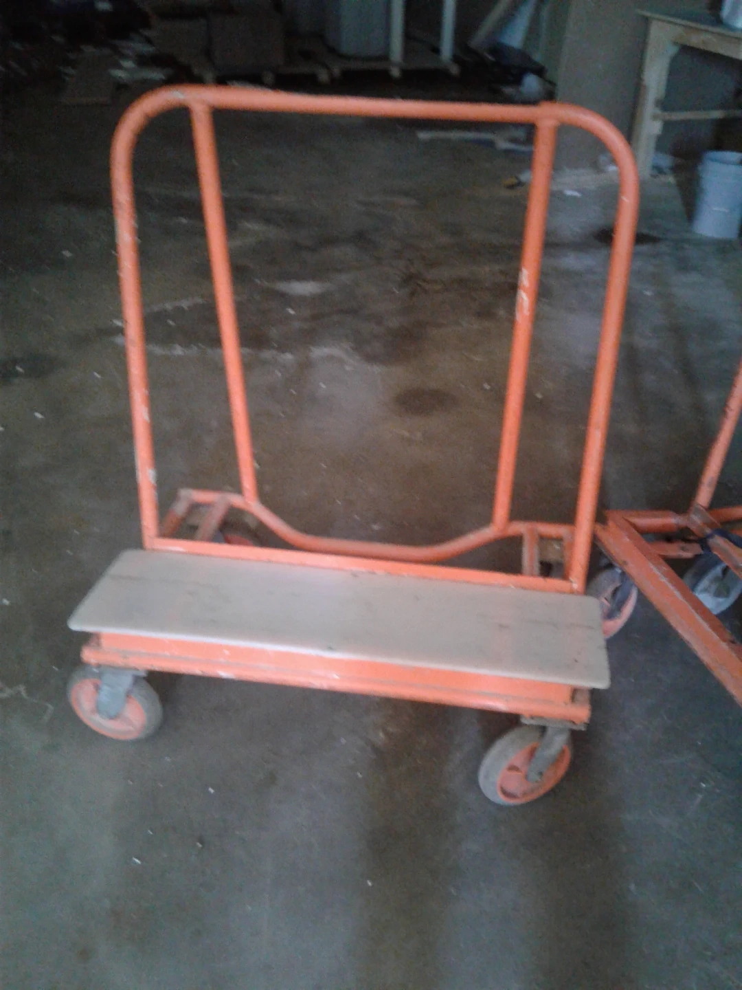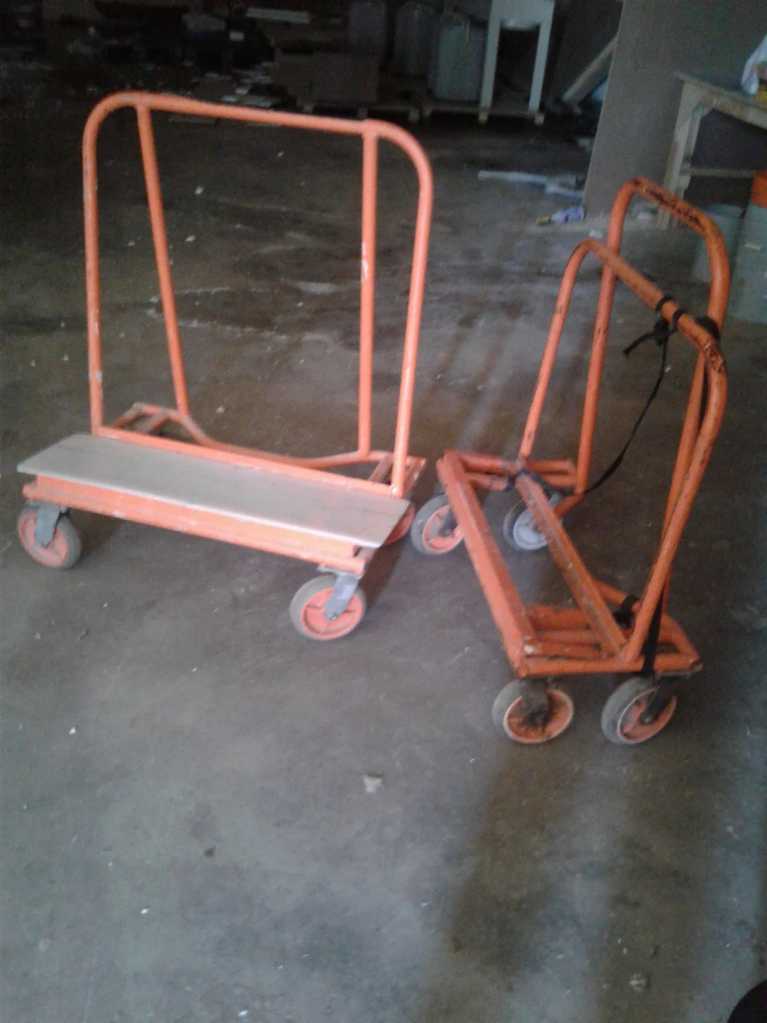 Selling a 2 used orange drywall cart. It's showing signs of wear and use, but still works great for moving drywall or other heavy materials! Perfect for your next reno project