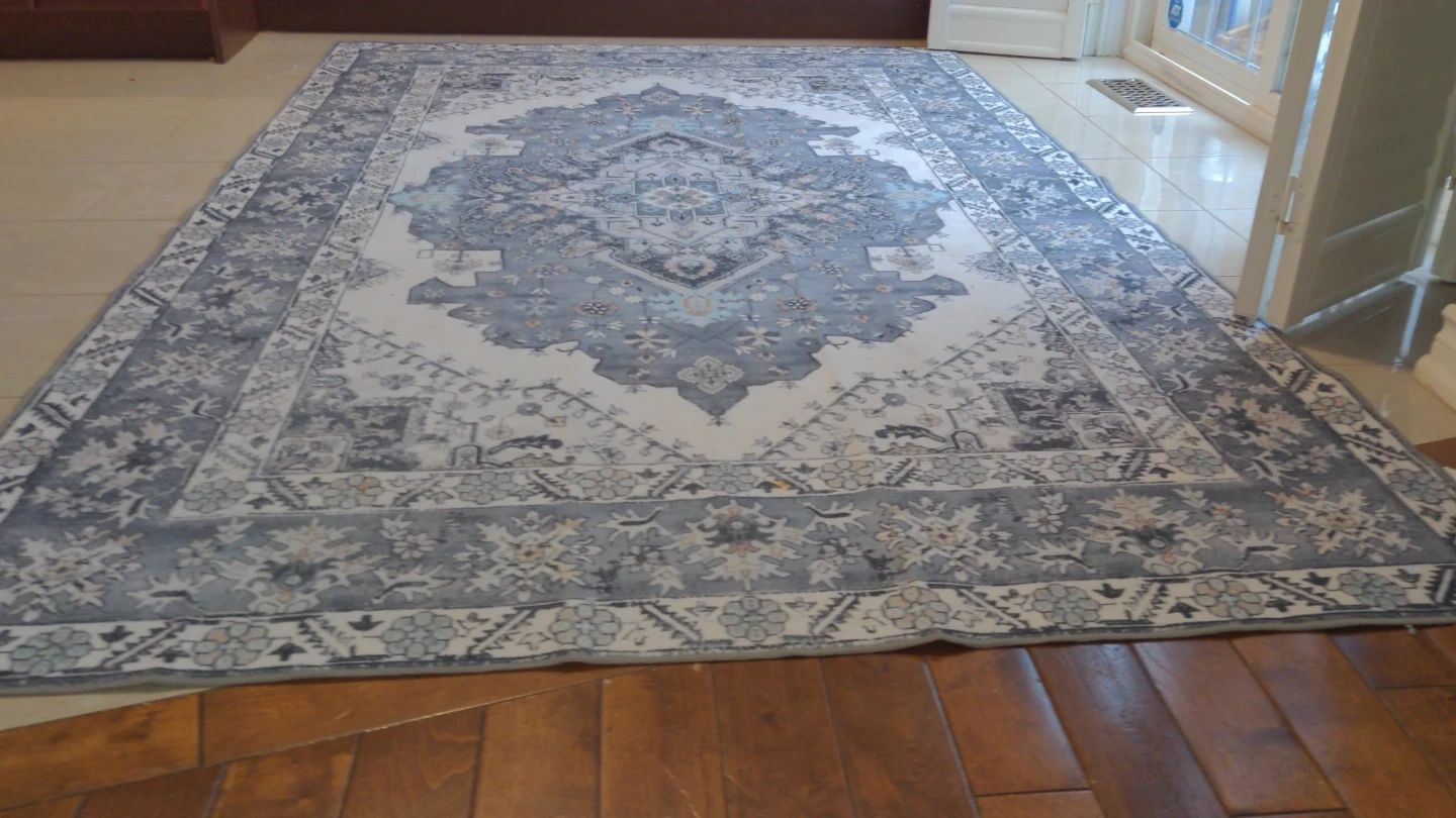 Brand New beautiful Area Rug. Used for one weekend to stage a home. Best part about this is it's washable💦🫶. Gentle cycle, hang dry and BOOM! It's also light and easy to roll or fold.I have small kids and we all know what can happen in a split second.