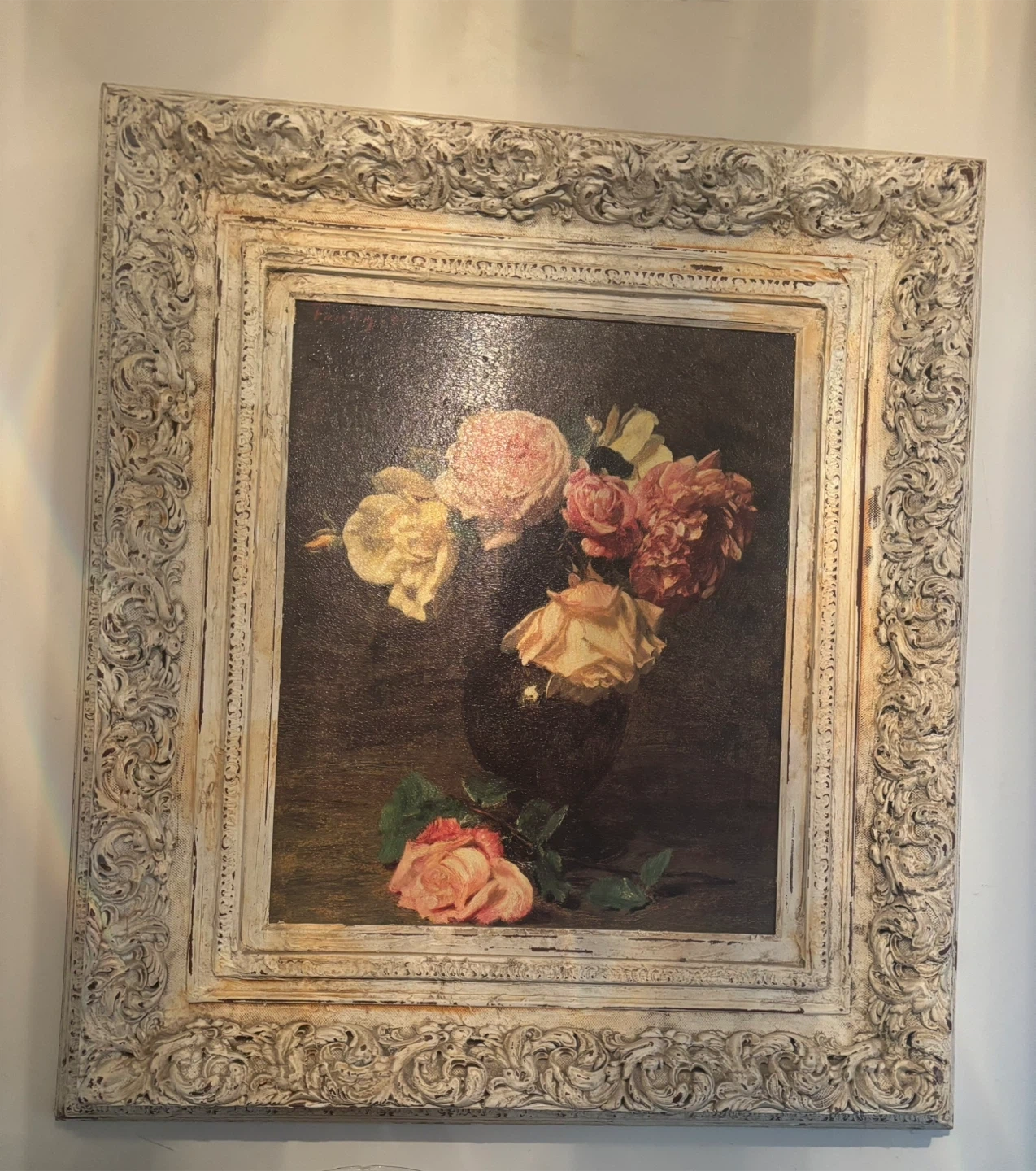 A vintage floral painting with a beautiful ornate frame. The painting features various roses in shades of yellow, pink, and red. This piece would add a touch of classic elegance to any room
