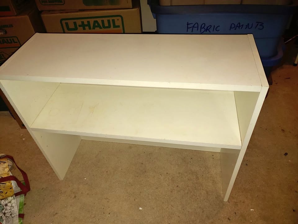 This table shelf can be on a table or as a stand alone table. Actually, it is quite versatile. It was used as a tv stand but I am moving.