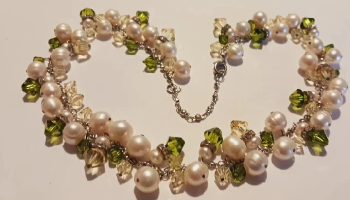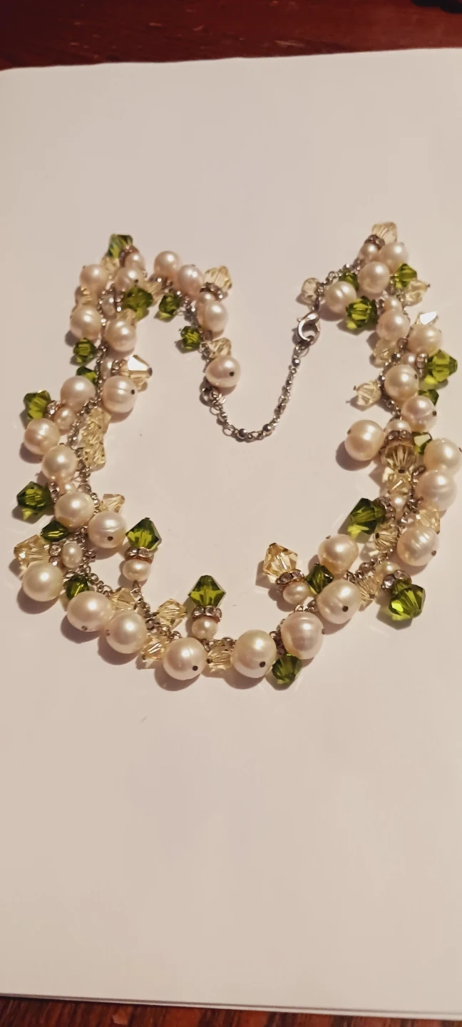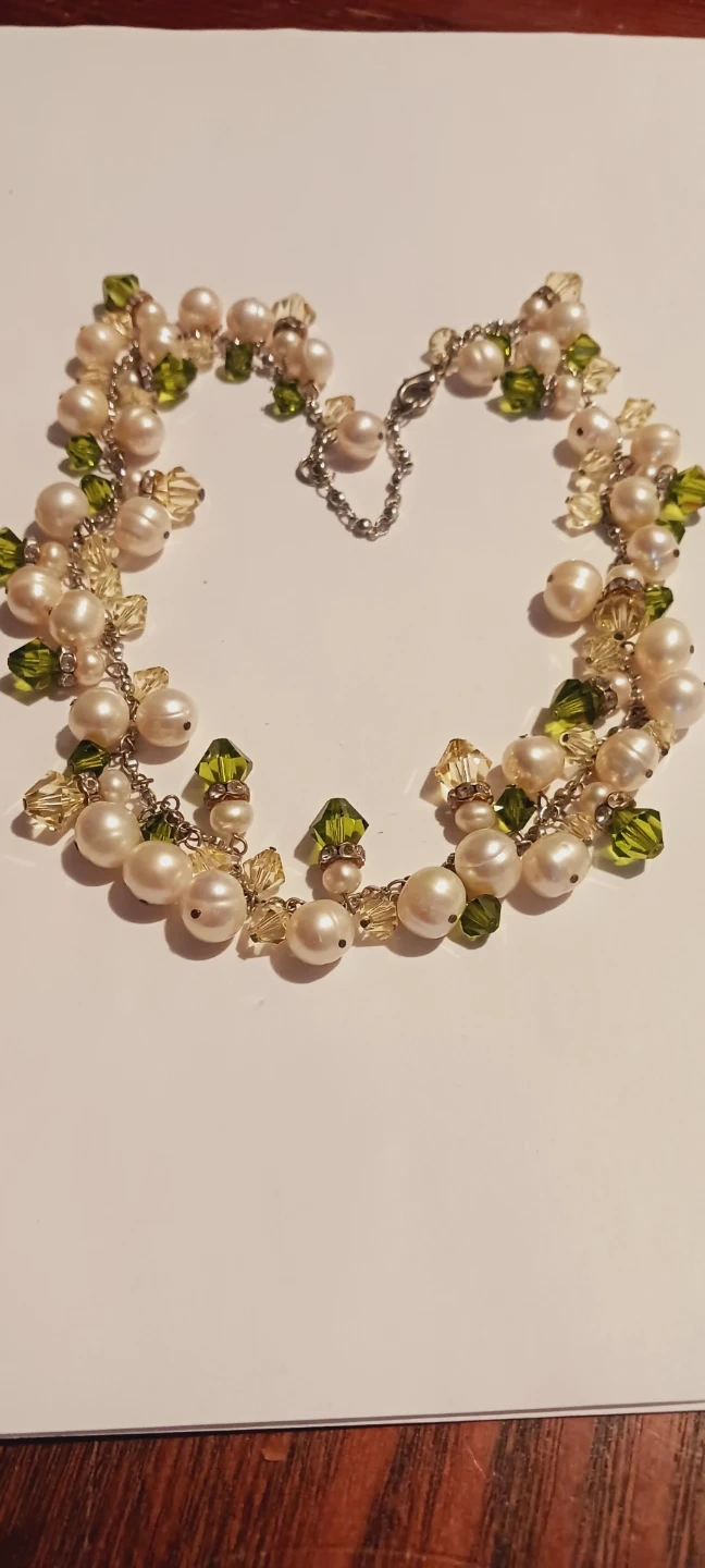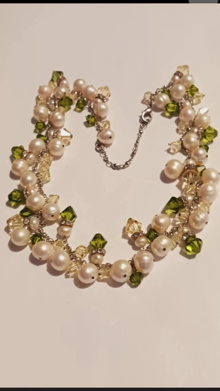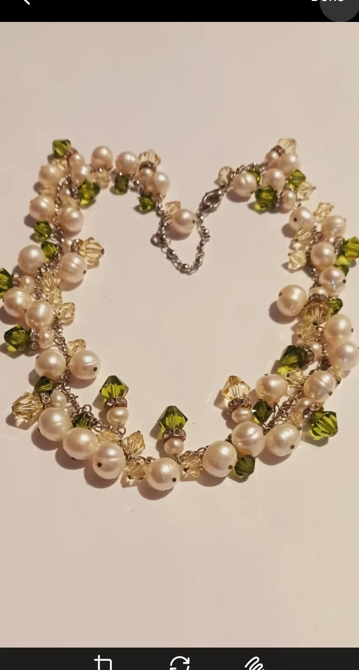 This is a beautiful necklace with genuine Freshwater pearls & Peridot Torsade necklace. It has a silver-tone chain and clasp. The pearls are cream colored and the peridot crystals are green and clear. It's in great condition and ready to wear!! 16" long.