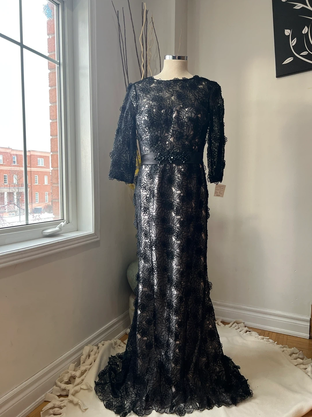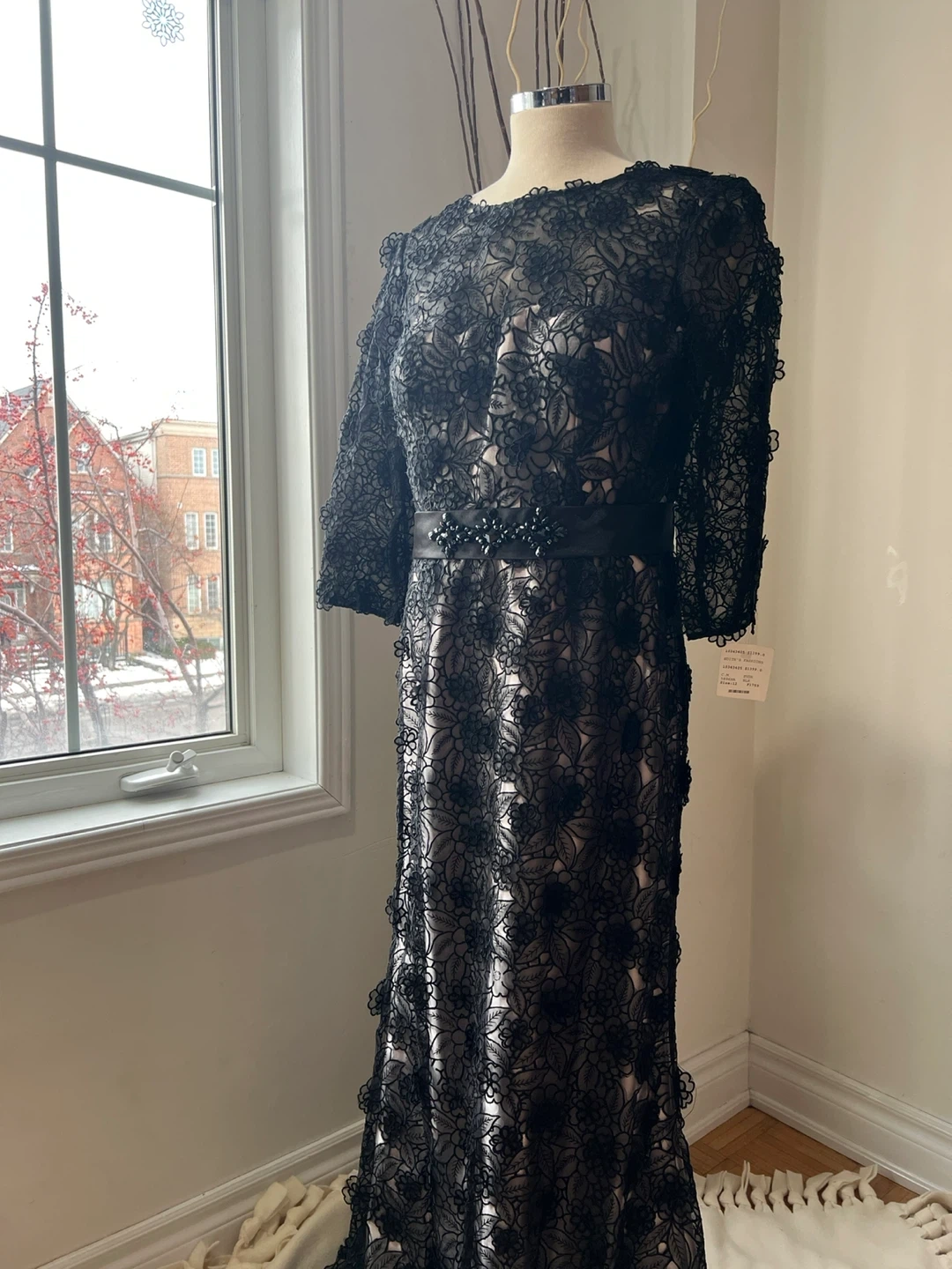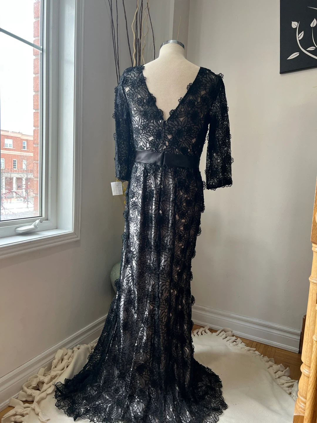 Selling a beautiful black lace formal dress. It features a delicate floral lace overlay and a flattering silhouette. Perfect for a special occasion! Original price $1399
