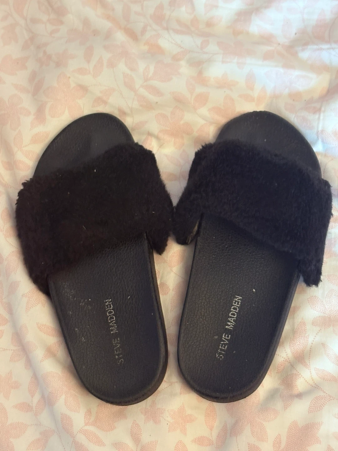 Selling a pair of Steve Madden fuzzy slides in black. They're super comfy and perfect for wearing around the house or running quick errands!