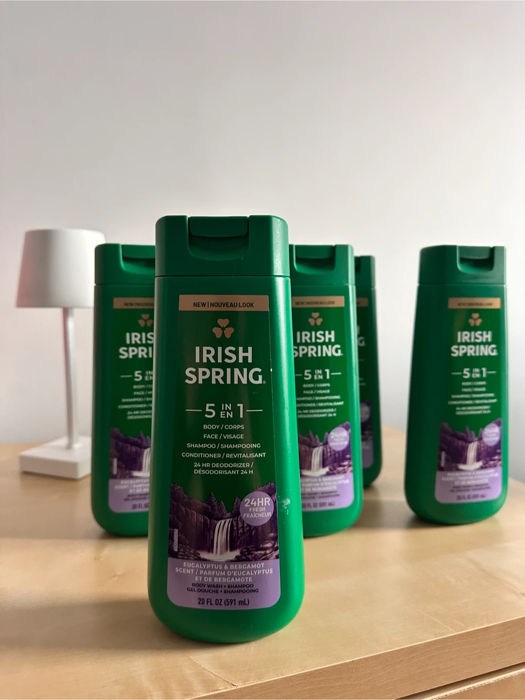 I have some bottles of Irish Spring 5 in 1 body wash for sale! They are 20 fl oz (591 mL) each. It's a body wash, face wash, shampoo, conditioner and 24 hour deodorant all in one! The scent is eucalyptus and bergamot.