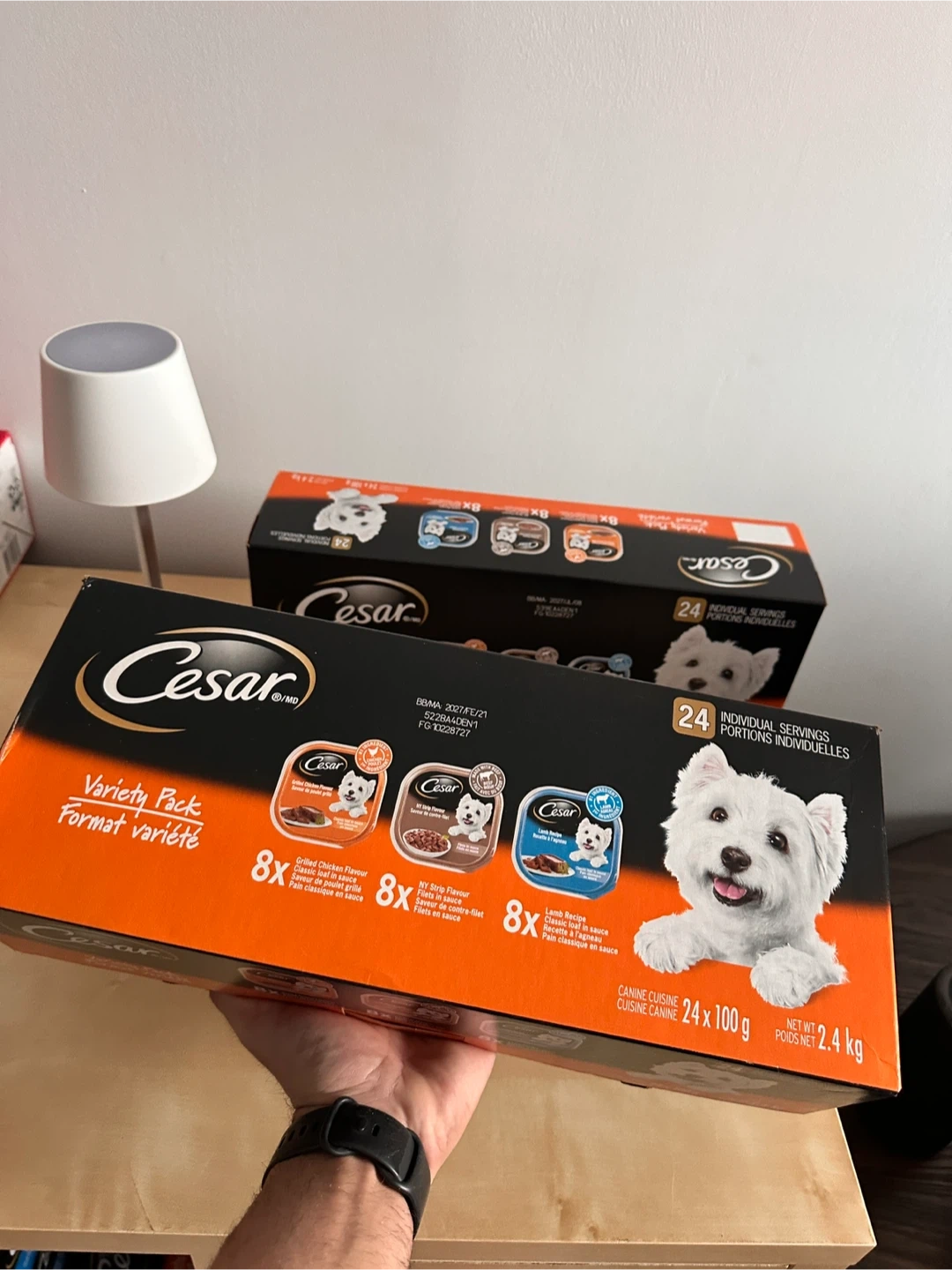 Selling a Cesar Variety Pack of dog food. This pack contains 24 individual servings of canine cuisine, with a net weight of 2.4 kg. It includes: