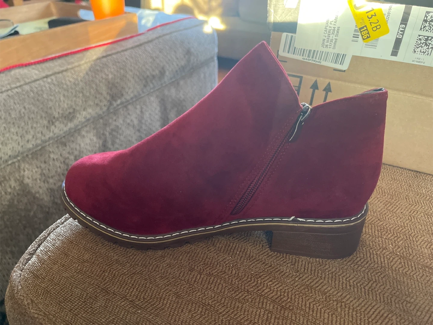 Selling a stylish burgundy ankle boot! It features a convenient side zipper and a comfortable low heel. Perfect for adding a pop of color to your wardrobe, rubber soled