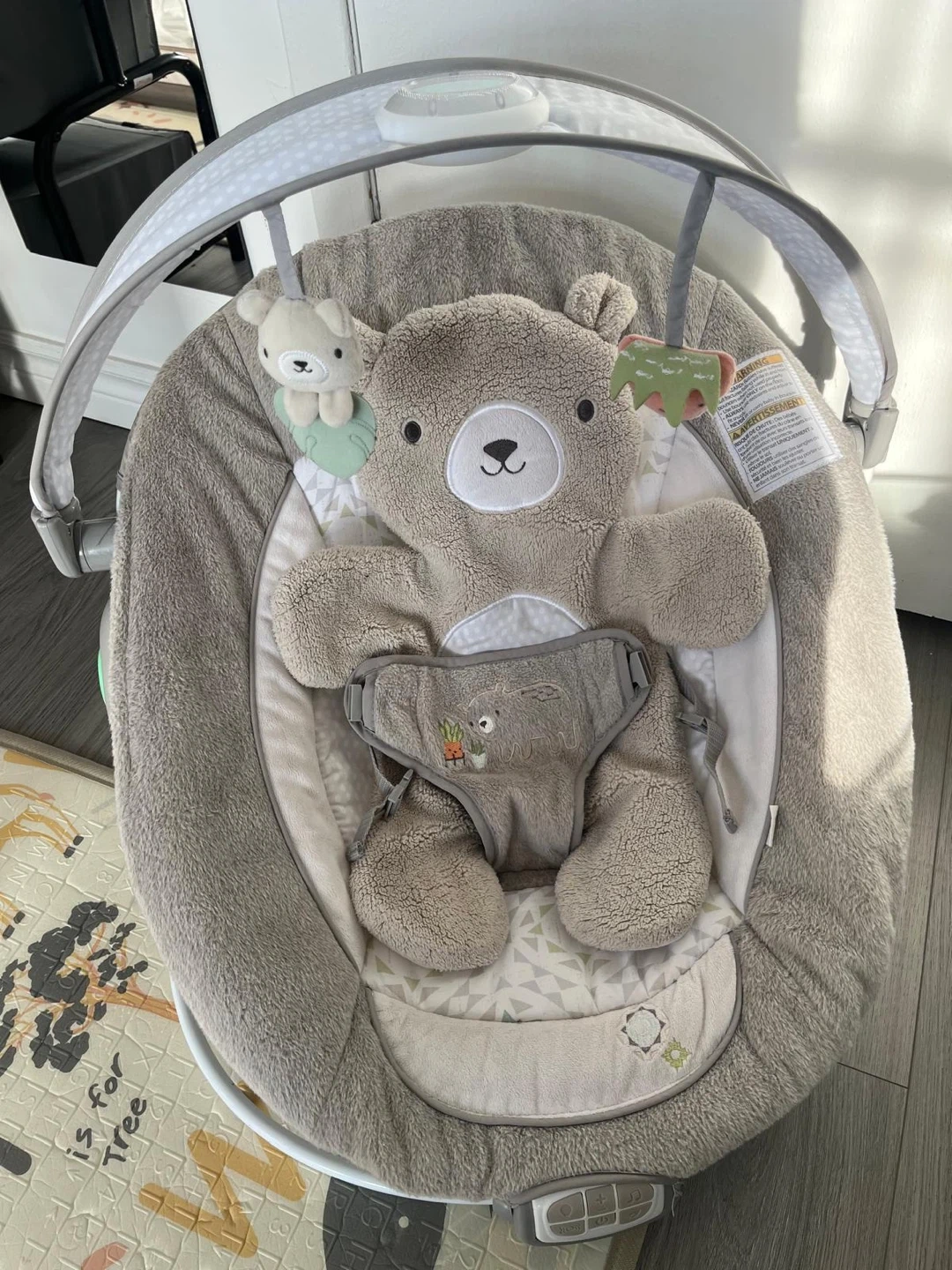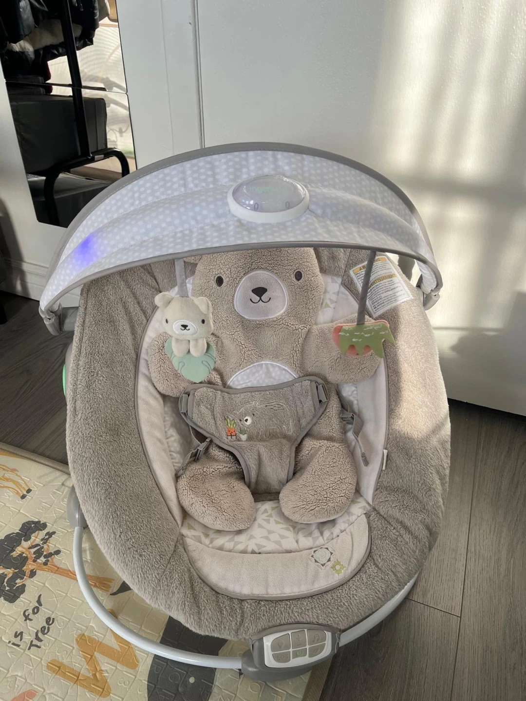 Selling an Ingenuity InLighten Baby Bouncer Seat with Light Up Toy Bar and Bunny Tummy Time Pillow Mat. It's perfect for newborns and up! It's in good condition and ready for a new little one to enjoy.